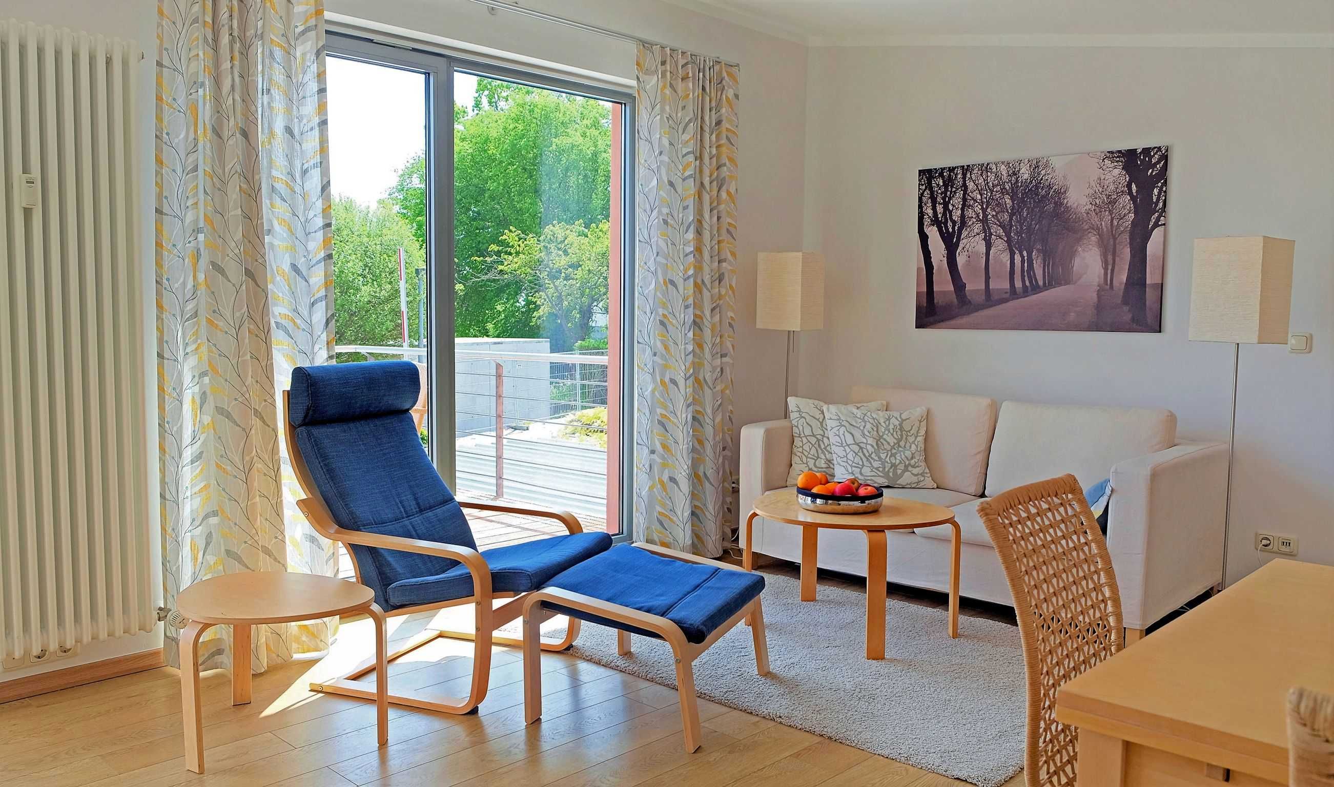 Große Fenster zu den Balkonen hin sorgen für den ganzen Tag über lichtdurchflutete Räume. Die Wohnung verfügt über ein Schlafzimmer, welches mit einem Doppelbett ausgestattet ist und über einen Wohnraum in dem sich ein Schlafsofa befindet.