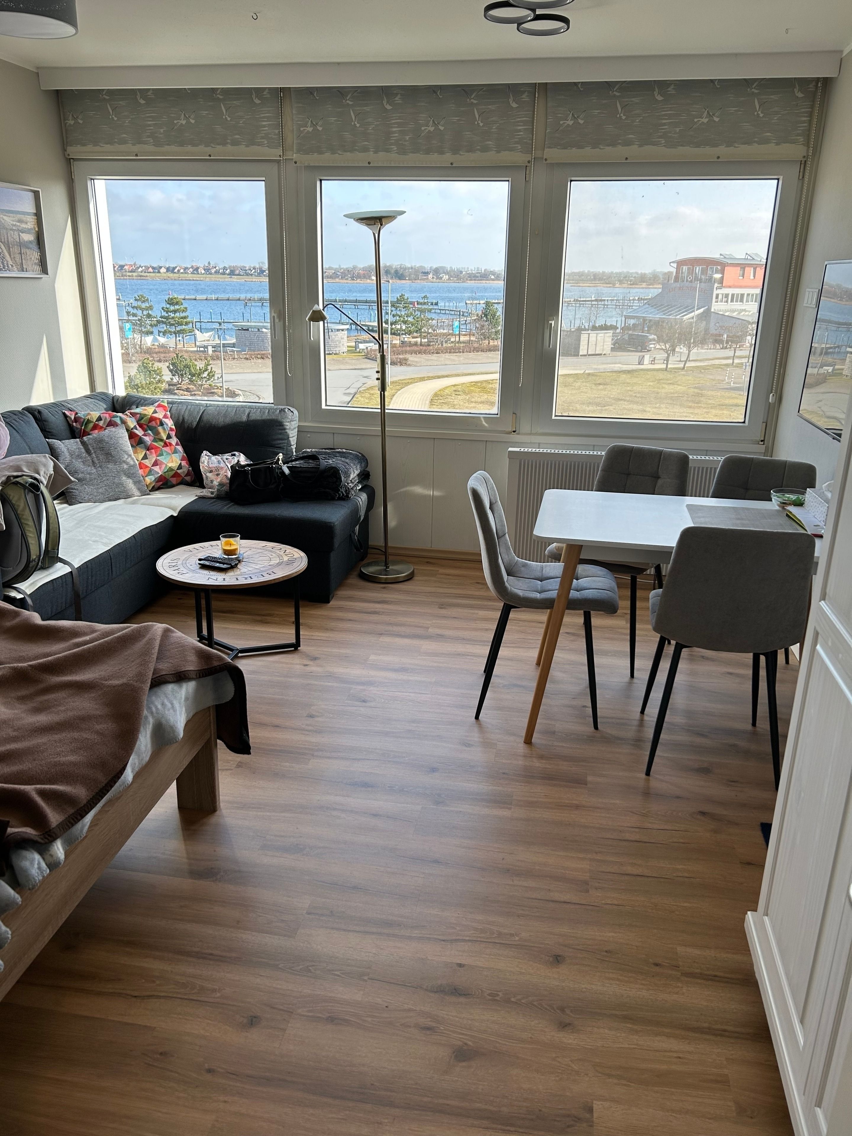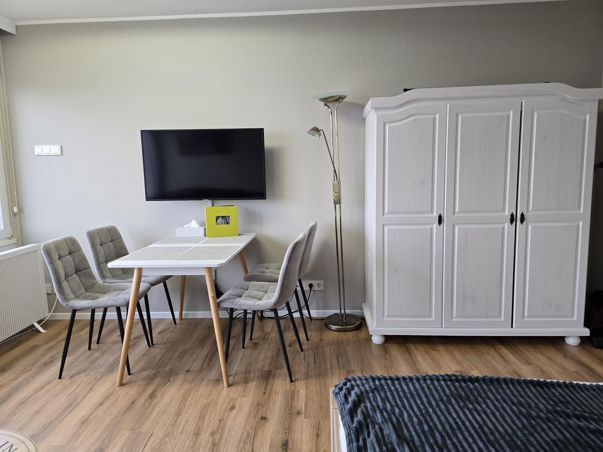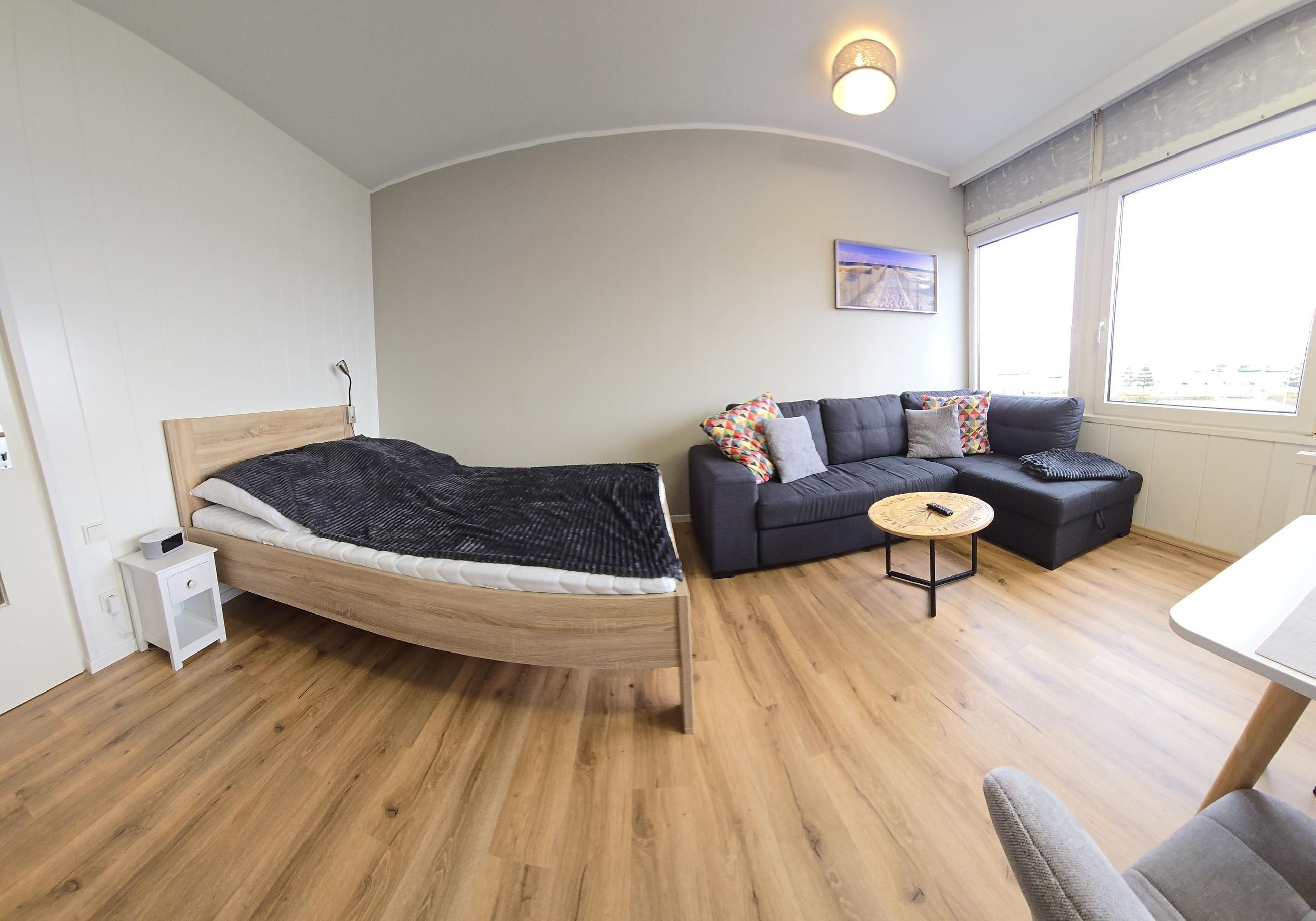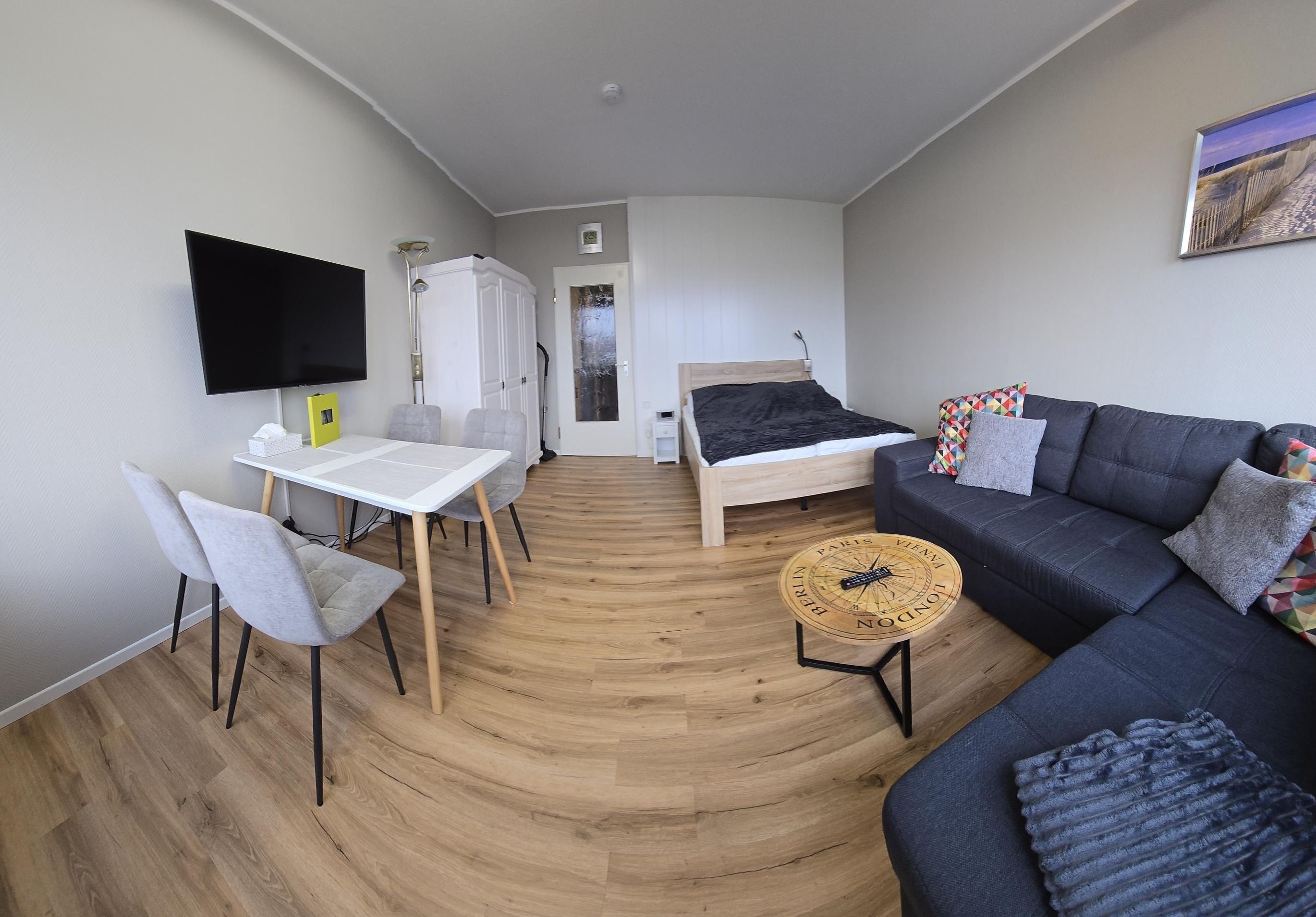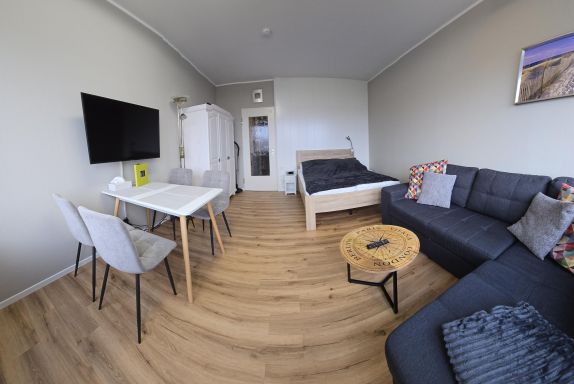 Sie verfügt über einen Wohn/Schlafraum mit einem Doppelbett (140x200), einem kleinen Sofa, sowie einem Esstisch mit vier Stühlen.