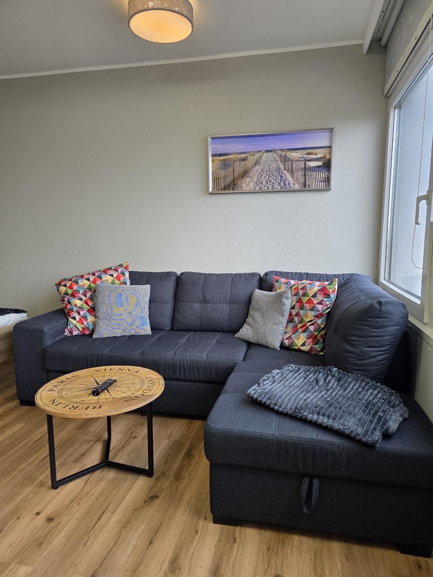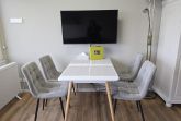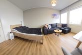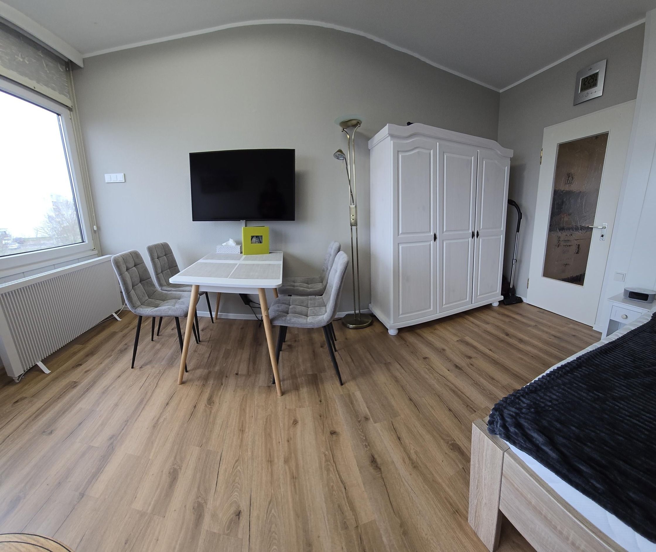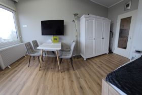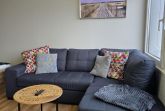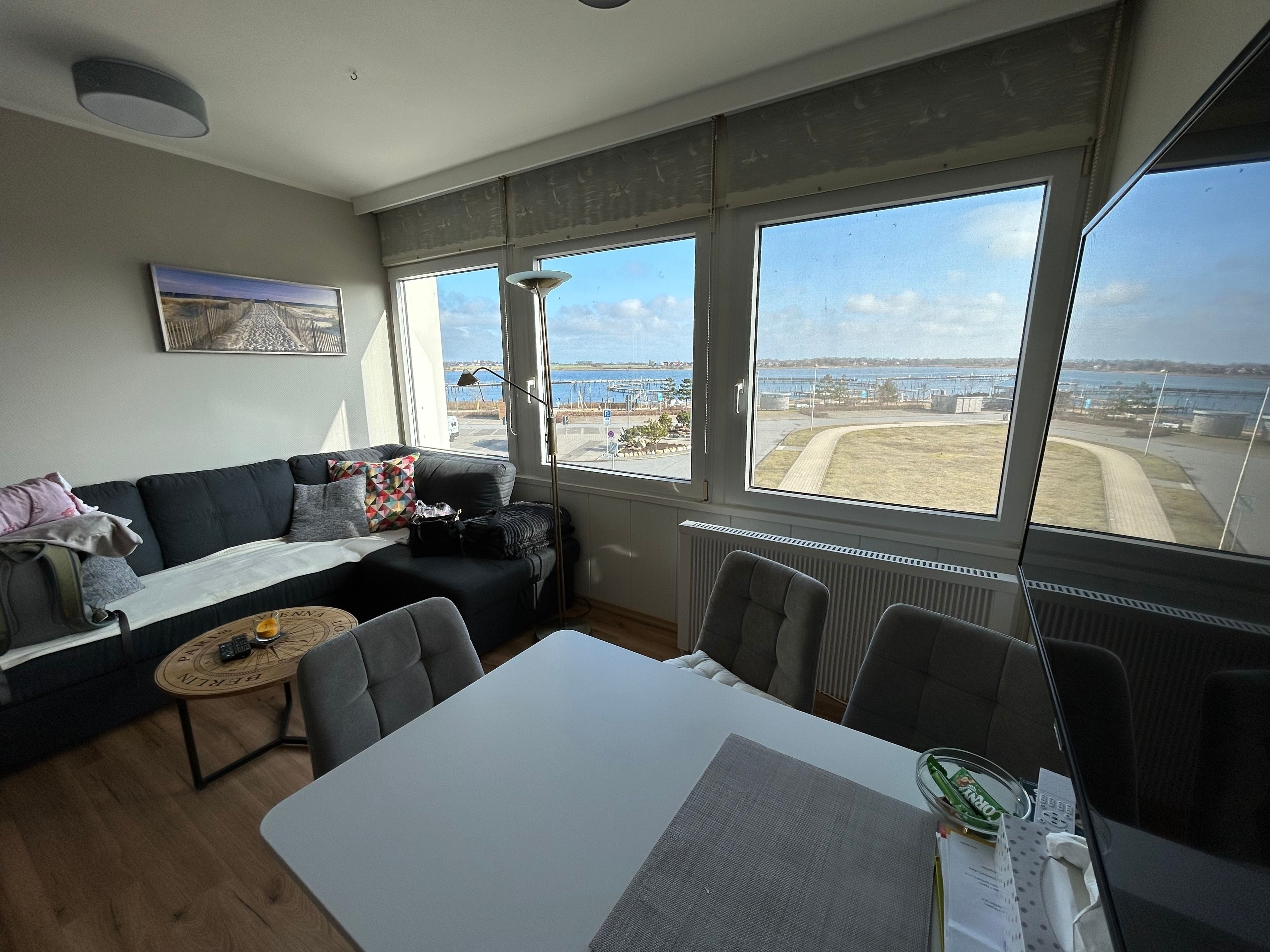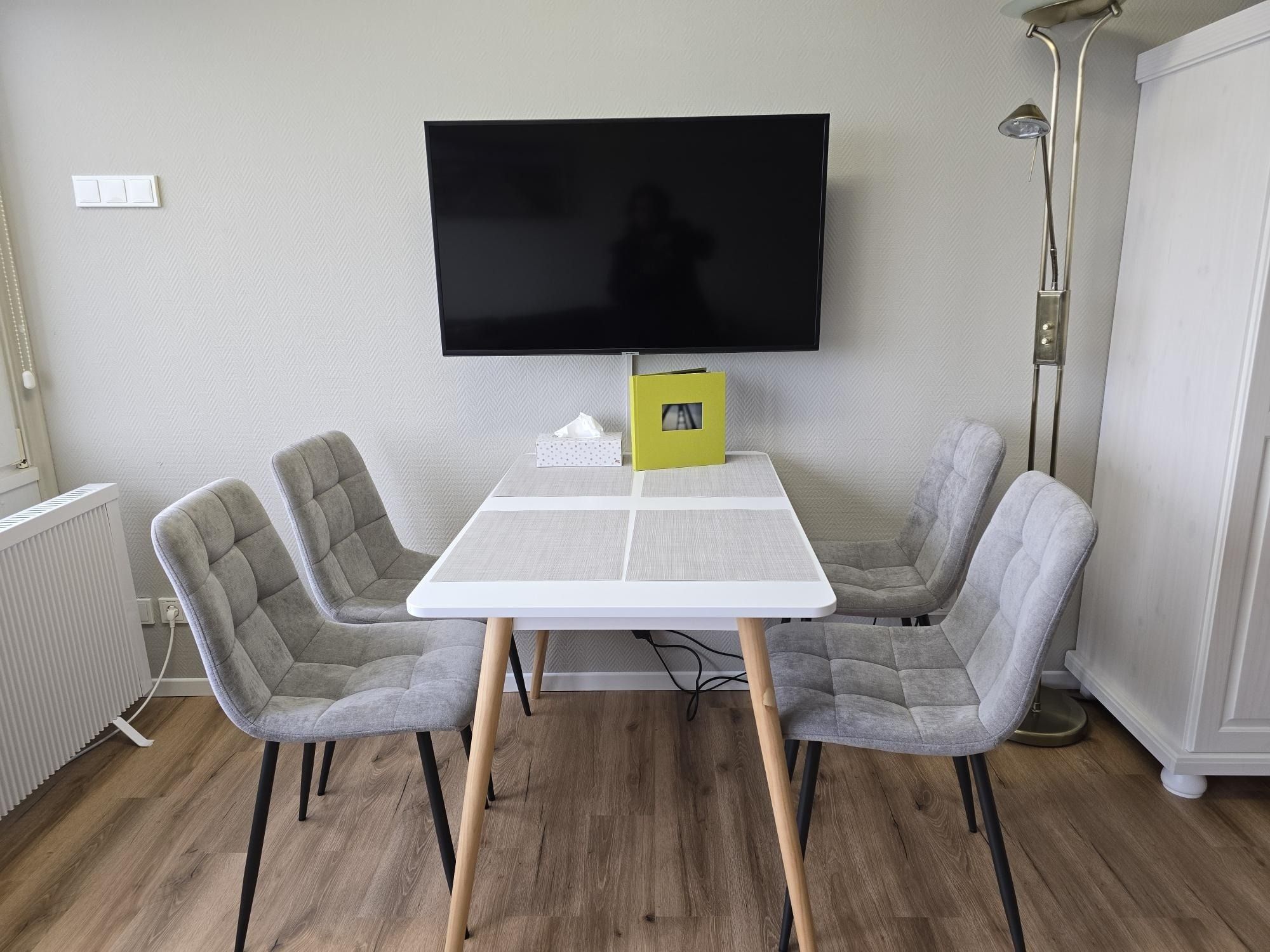 Sie verfügt über einen Wohn/Schlafraum mit einem Doppelbett (140x200), einem kleinen Sofa, sowie einem Esstisch mit vier Stühlen.
