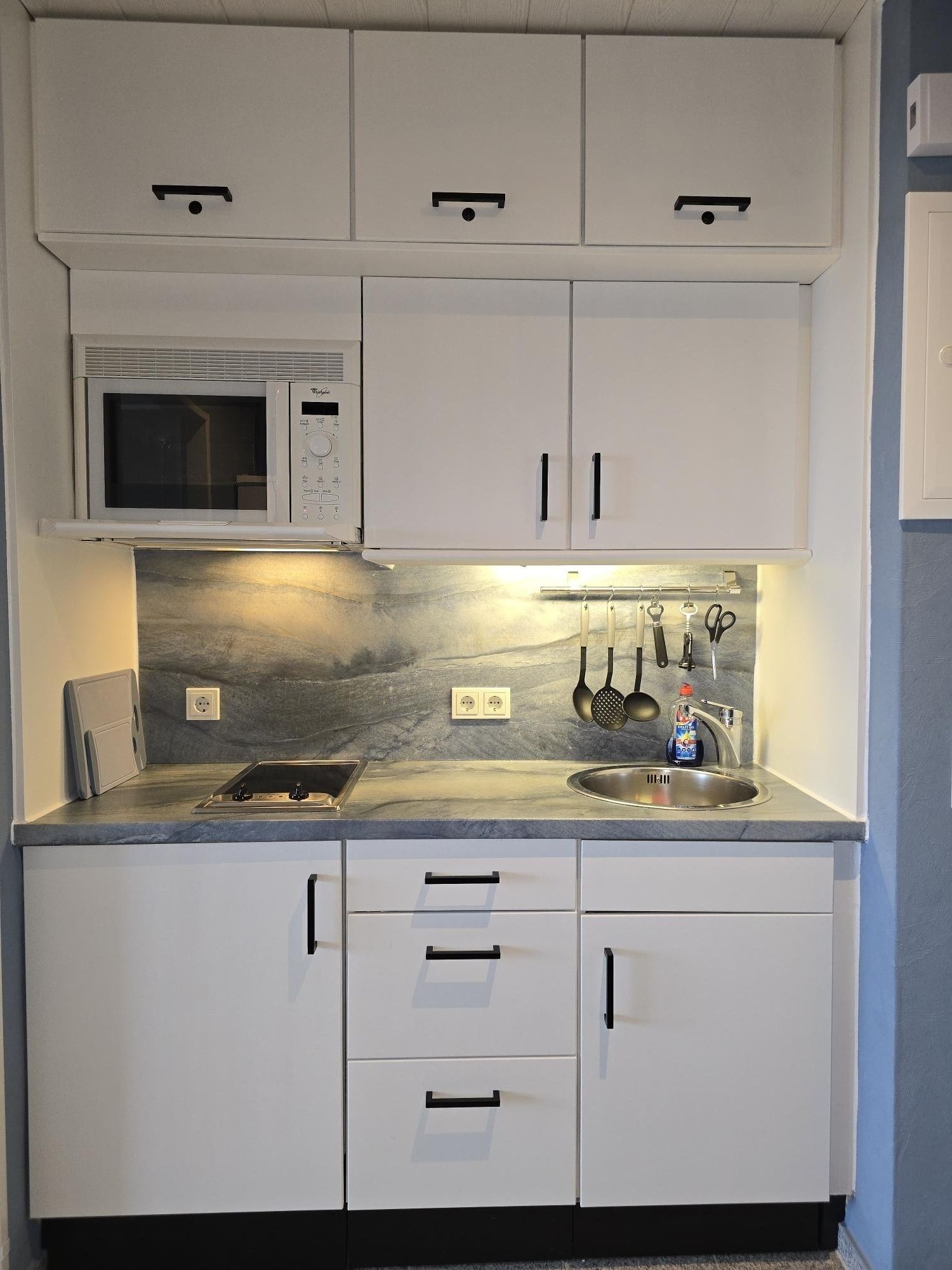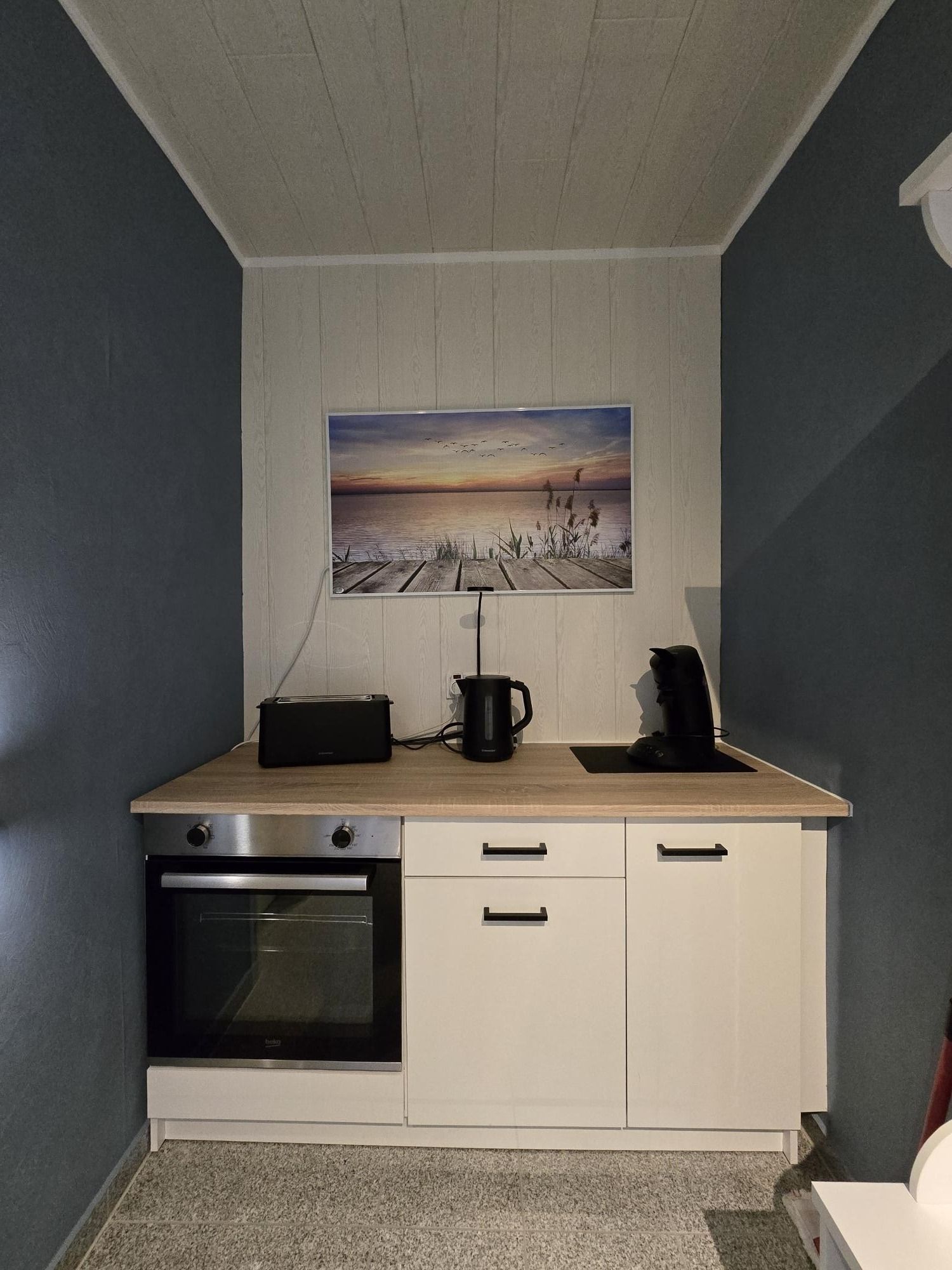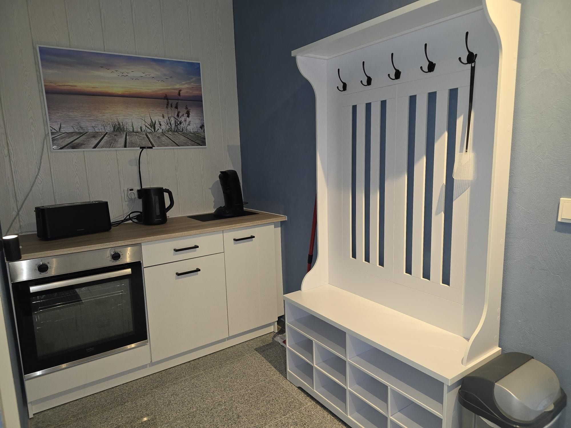 Im Eingangsbereich befindet sich die voll ausgestattete Küchenzeile mit einem Ceranfeld mit 2 Kochfeldern, Backofen, Kühlschrank mit Gefrierfach, Mikrowelle, Kaffeemaschine, Wasserkocher, Toaster und Eierkocher.