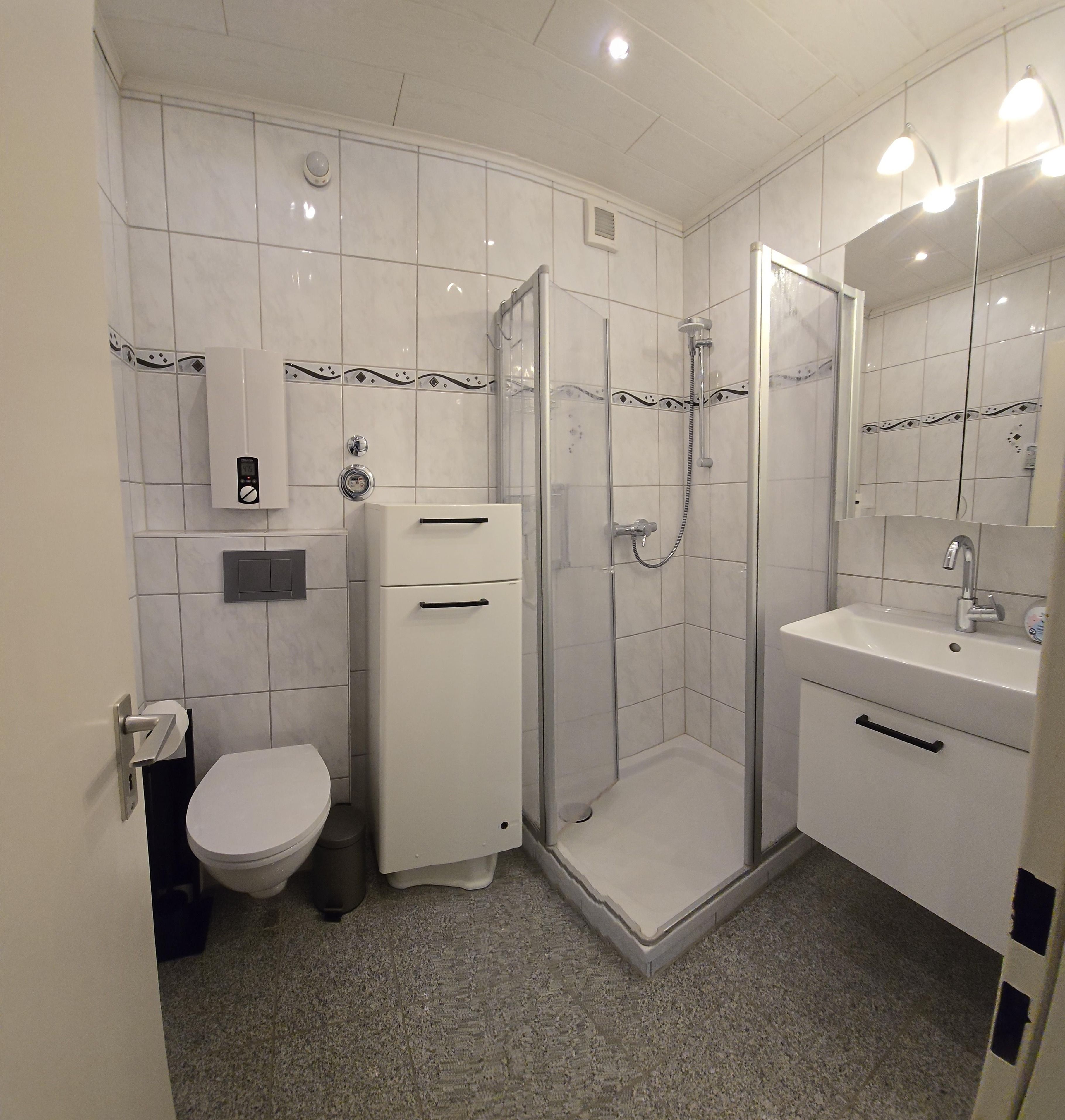 Das Badezimmer ist mit einer Dusche ausgestattet.