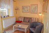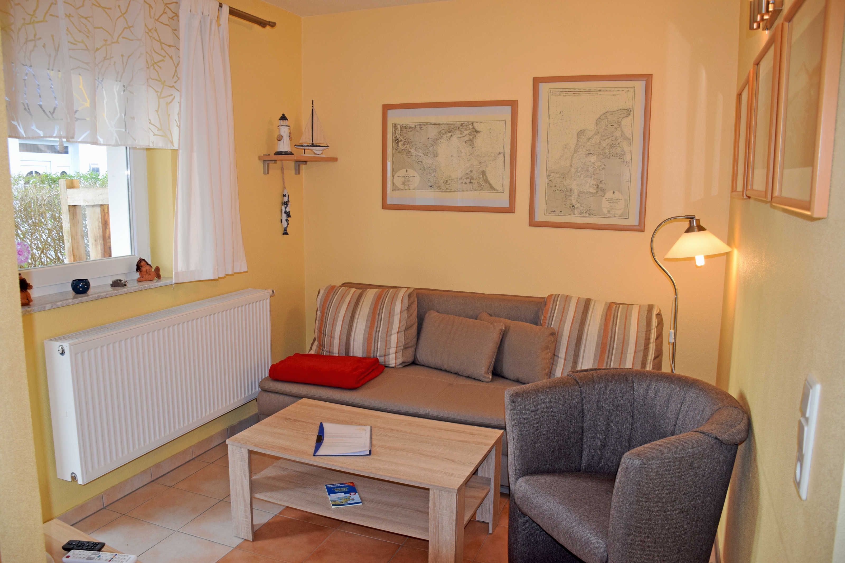 Vom Küchenbereich gelangen Sie in den Wohnbereich mit Doppelbettcouch (Aufbettung für 2 weitere Gäste) und Clubsessel. In den vorhandenen Ablagemöglichkeiten haben wir Lektüre, Spiele und Informationen für Ihre Urlaubsgestaltung bereitgestellt. TV empfangen Sie über einen regionalen Kabelanschluss mit ca. 36 Programmen. Im Bad befinden sich eine Dusche 90 x 90 cm, WC und Handwaschbecken sowie weitere Ablagemöglichkeiten.