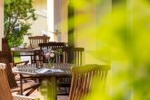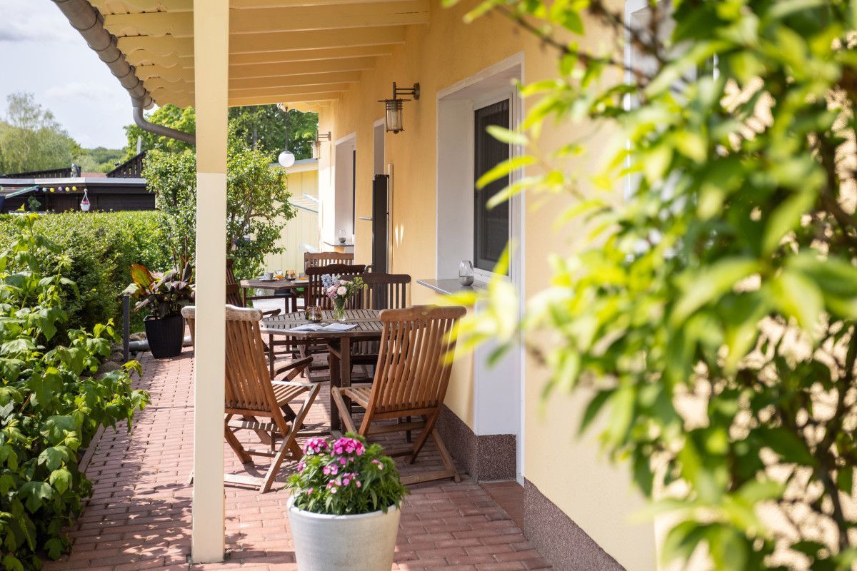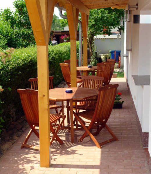 Die zum Ferienhaus gehörende überdachte Terrasse liegt nach Süden und bietet Sitzgelegenheiten und einen Strandkorb. Eine zweite offene Terrasse liegt mit Sitzgelegenheiten in den Innenhof. Der Parklatz befindet sich ca. 15 Meter entfernt auf der Anlage. Bei Ihrer Anreise sind die Betten selbstverständlich bereits mit Bettwäsche bezogen, Handtücher bitten wir Sie mitzubringen.