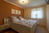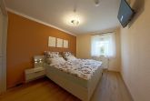 Ein geräumiges Schlafzimmer mit Doppelbett und großem Kleiderschrank, sowie TV befindet sich neben dem Duschbad .