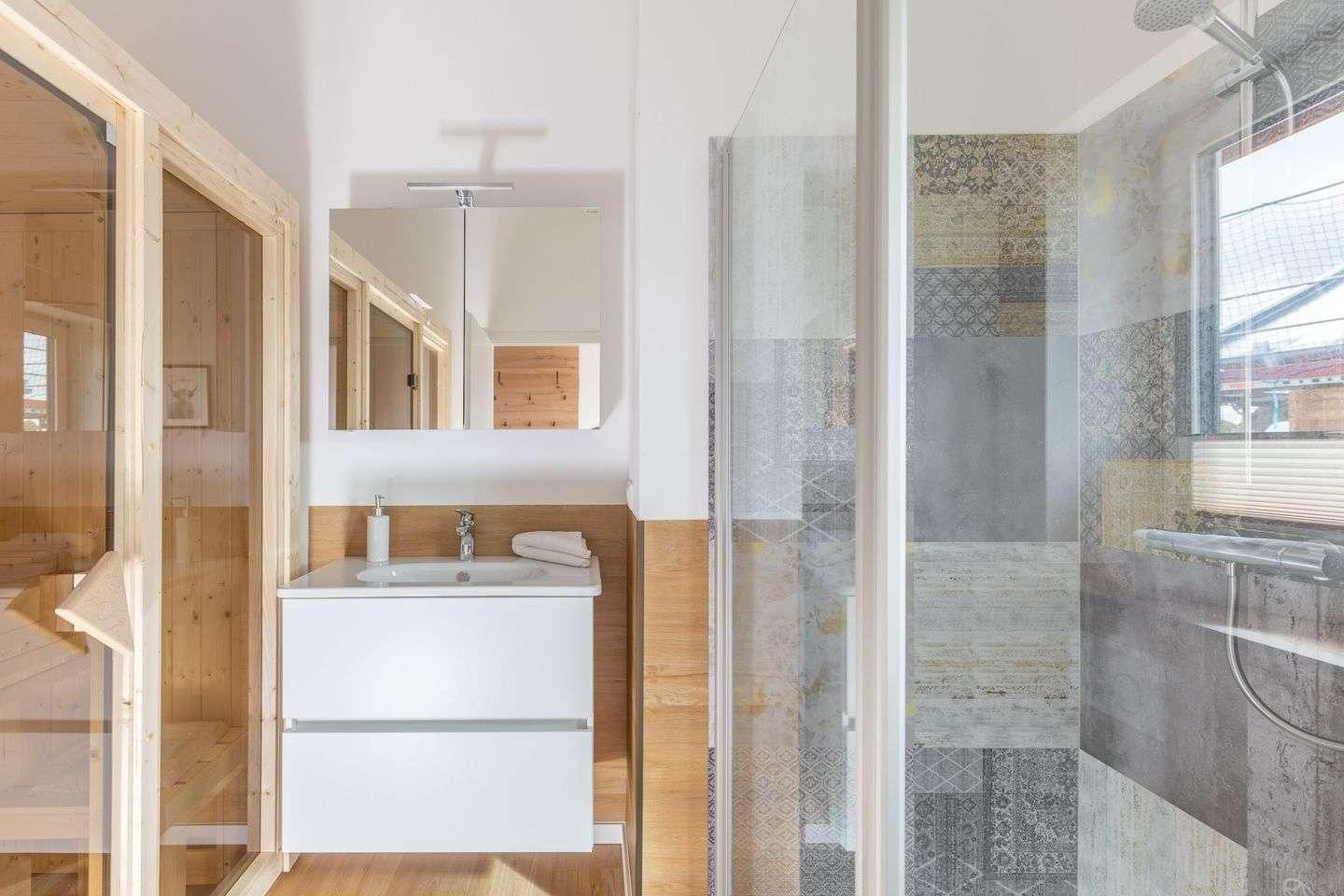 Ein modernes Badezimmer mit bodengleicher Dusche, WC und Sauna sorgen für besonderen Komfort.