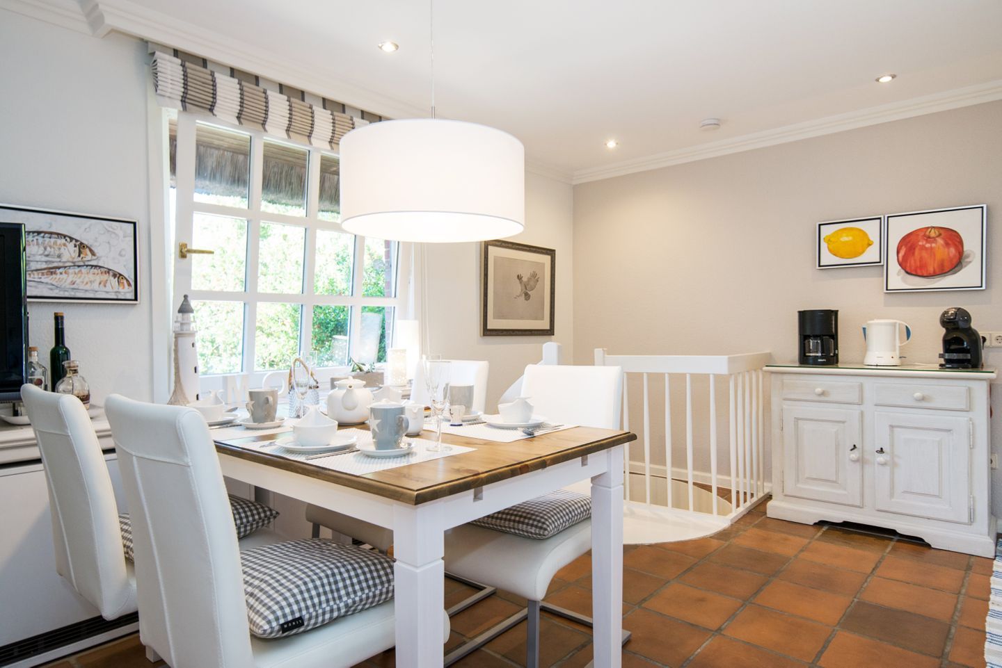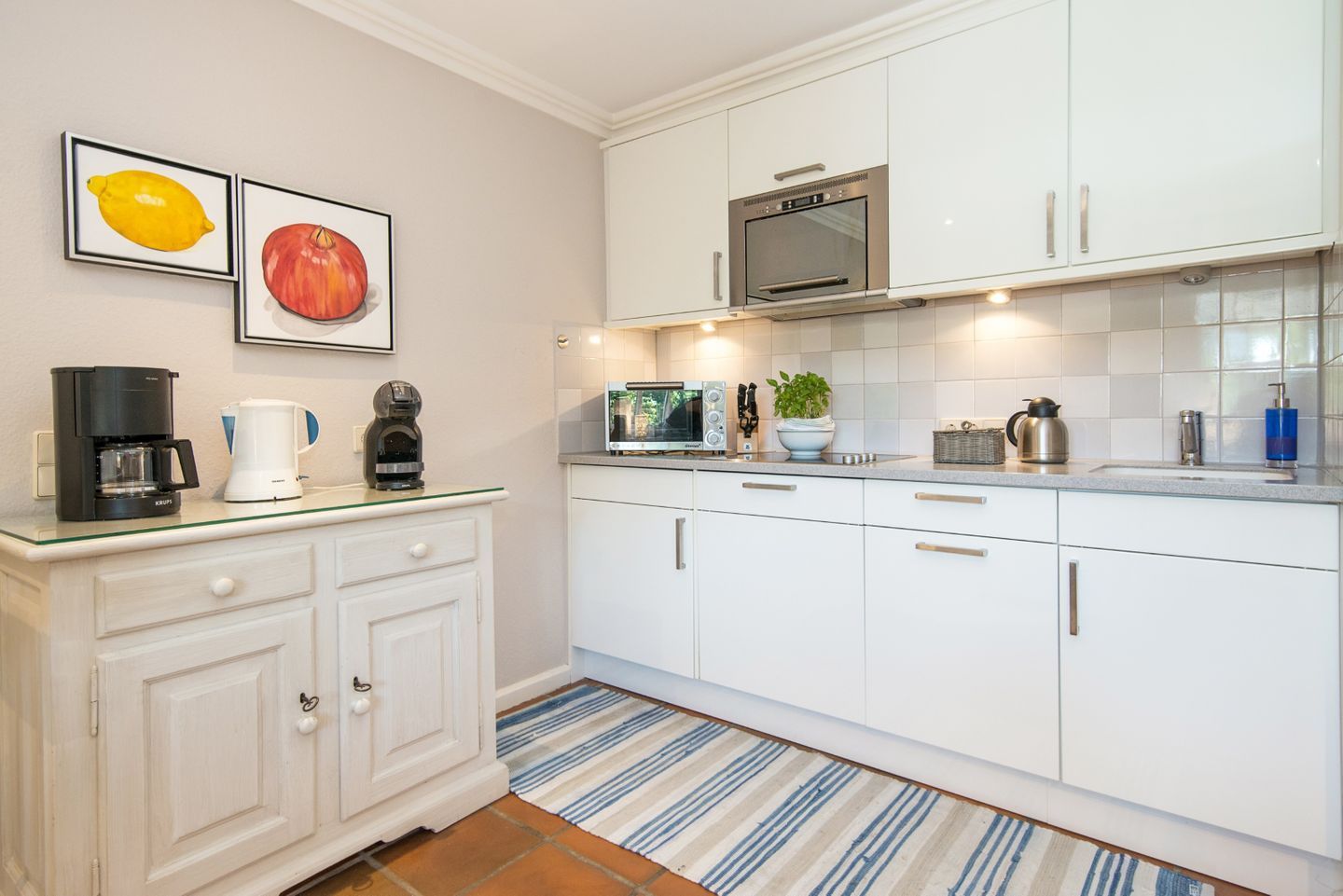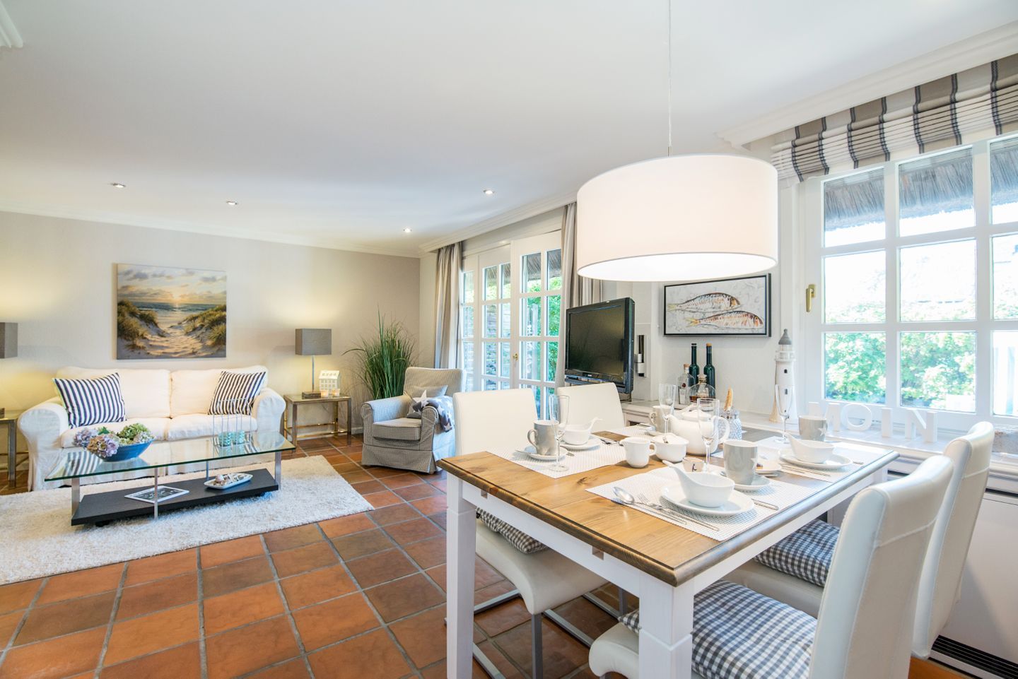 Das reetgedeckte Haus liegt in einer Wohnanlage mit parkähnlichem Grundstück und altem Baumbestand, das Wattenmeer und ein Edeka-Markt mit Bäckerei sowie etliche namhafte Gastronomien liegen im fußläufiger Entfernung.