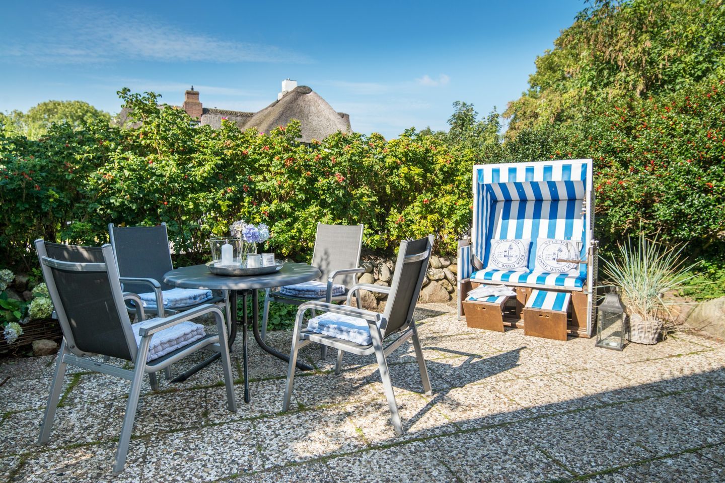 Ferner erschließt sich von hier aus die weitläufige eingewachsene Terrasse umgeben von einem Friesenwall mit Strandkorb und Gartengestühl ( ca. April - Oktober) , wo Sie einen erlebnisreichen Sylt-Tag gemütlich ausklingen lassen können.