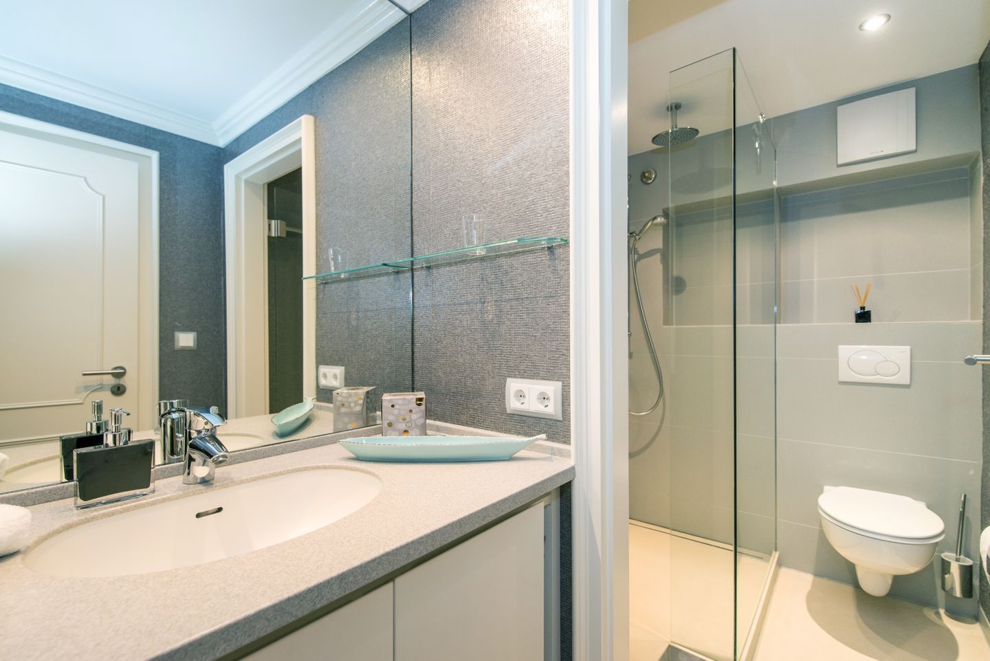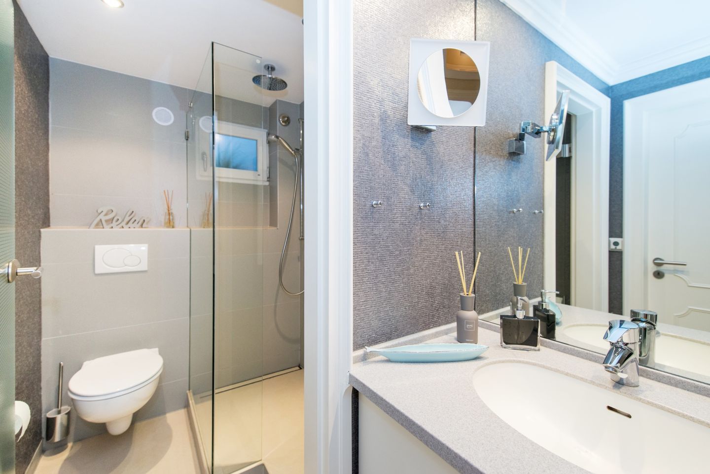 Zusätzlich stehen Ihnen zwei separate Schlafzimmer mit hochwertigen Boxspringbetten sowie zwei zugehörige Badezimmer mit Klarglasduschen und Rainshower zur Verfügung. Das vordere Schlafzimmer (offen zur Treppe) verfügt über ein ensuite Badezimmer, das ist jedoch gleichzeitig ein Durchgangsraum zum hinteren Schlafzimmer. Auch das zweite Schlafzimmer besitzt ein eigenes ensuite Badezimmer und ist über einen kleinen Flur (mit Tür) vom vorderen ensuite Badezimmer abgetrennt