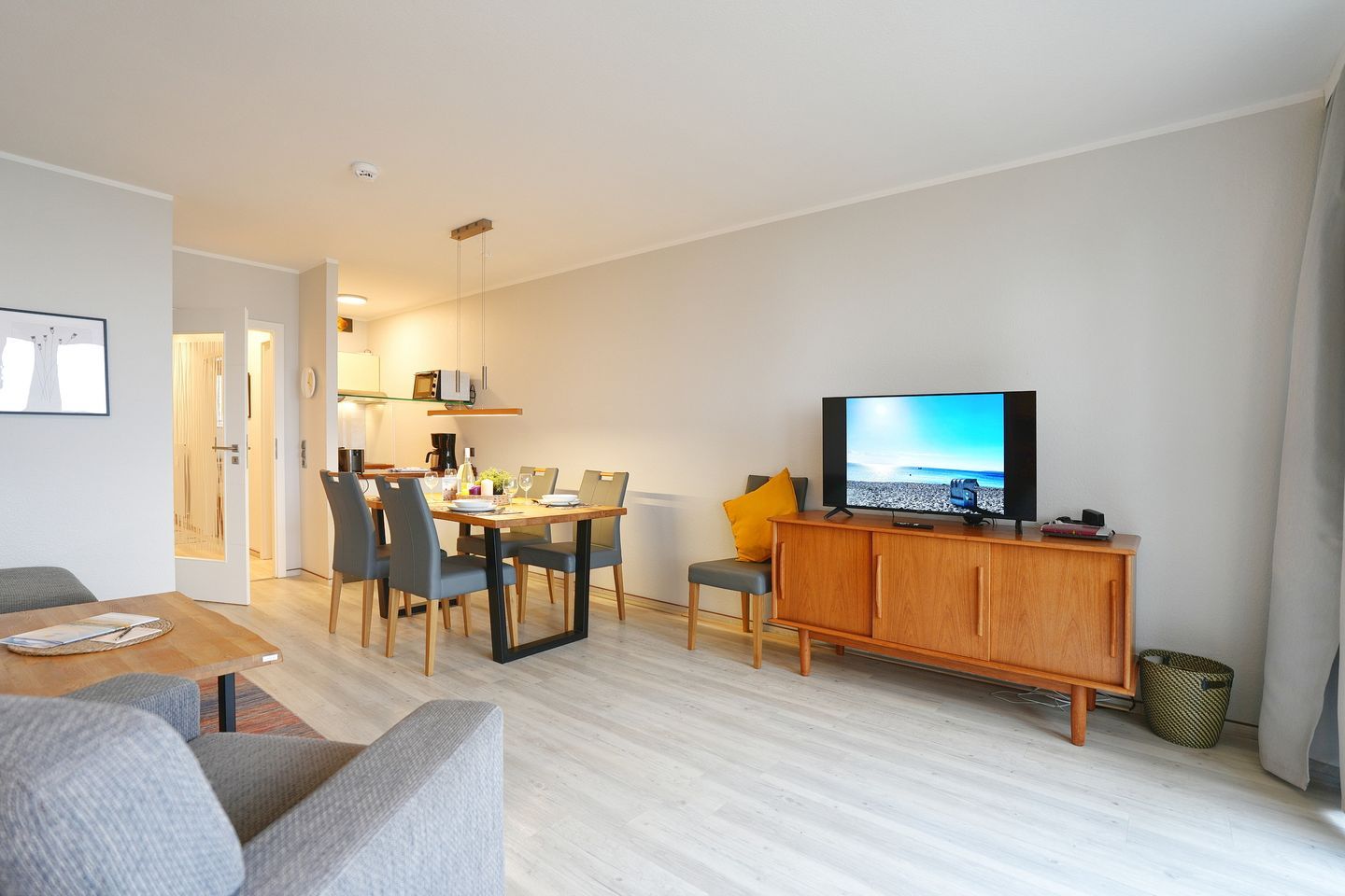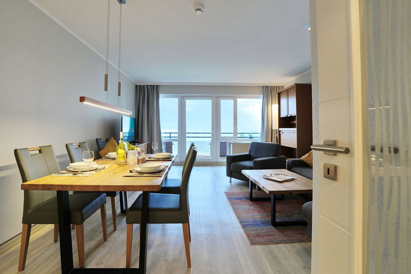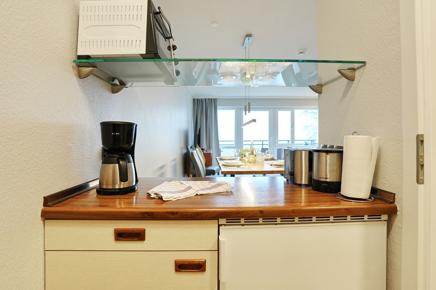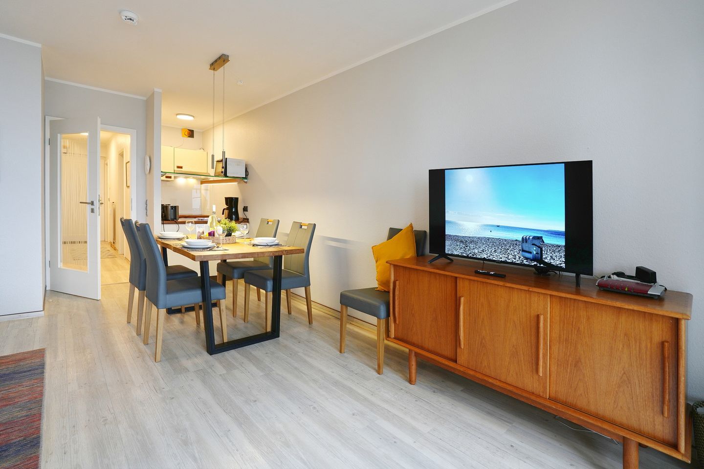 Im Wohnraum werden Sie mit einem traumhaften Blick auf die Ostsee begrüßt. Hier gibt es eine Sitzecke mit Fernseher sowie einen Eßtisch mit 5 Stühlen. Die kleine Pantryküche ist funktional mit einem 4 Platten Ceranfeld mit Dunstabzugshaube , Kühlschrank mit Gefrierfach und Spülmaschine ausgestattet.