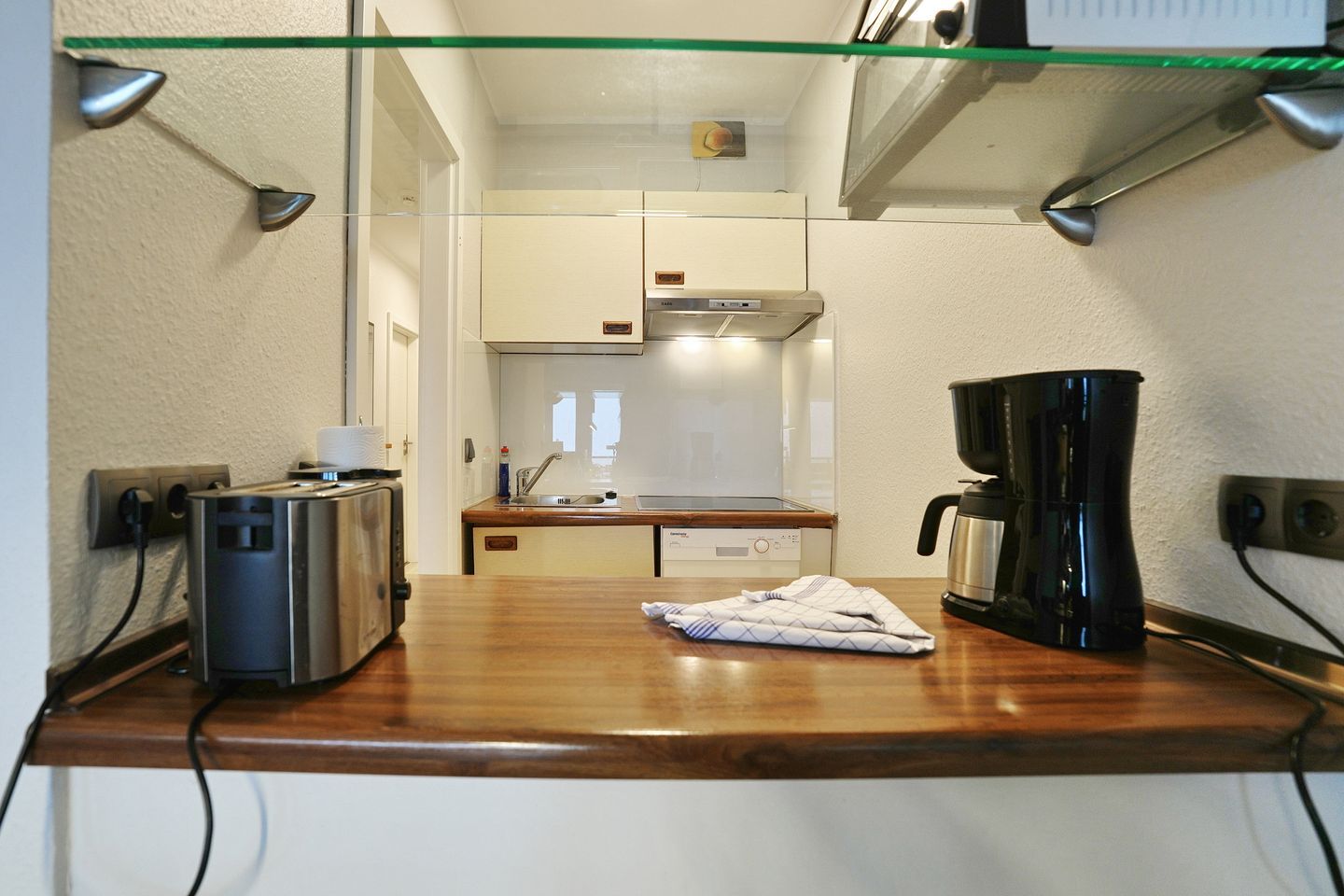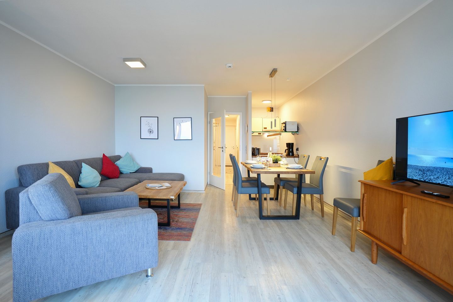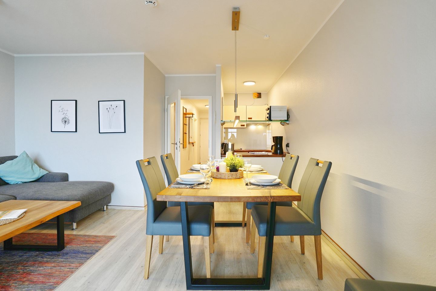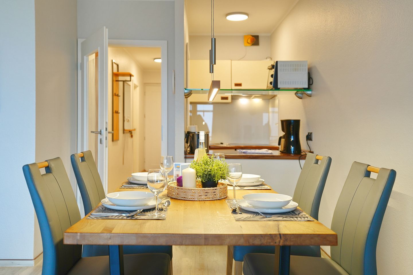 Im Wohnraum werden Sie mit einem traumhaften Blick auf die Ostsee begrüßt. Hier gibt es eine Sitzecke mit Fernseher sowie einen Eßtisch mit 5 Stühlen. Die kleine Pantryküche ist funktional mit einem 4 Platten Ceranfeld mit Dunstabzugshaube , Kühlschrank mit Gefrierfach und Spülmaschine ausgestattet.