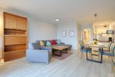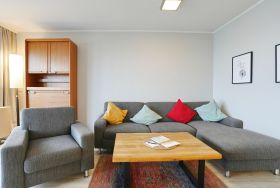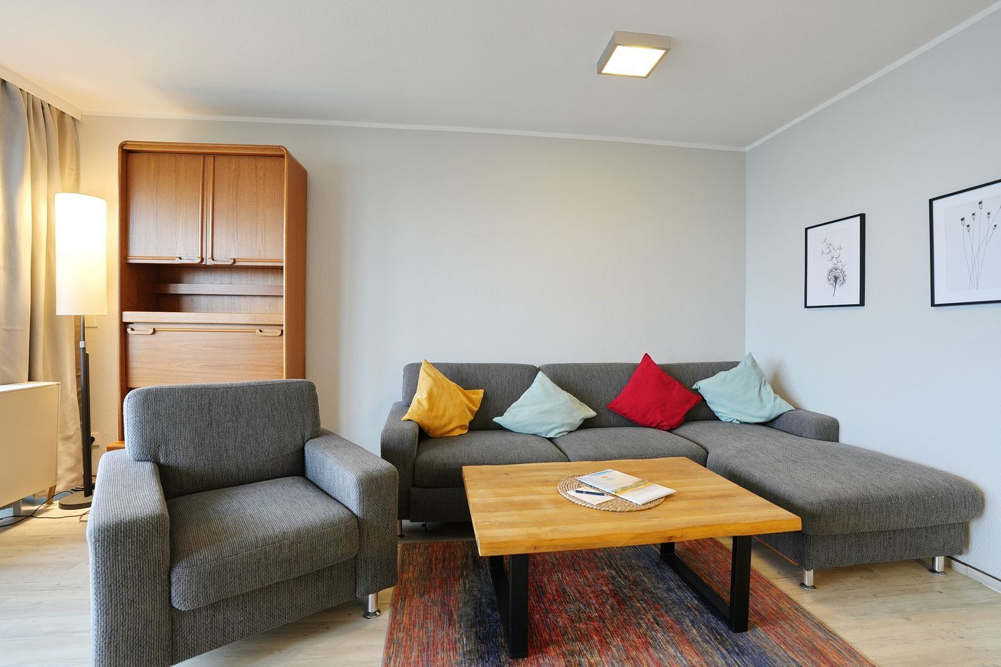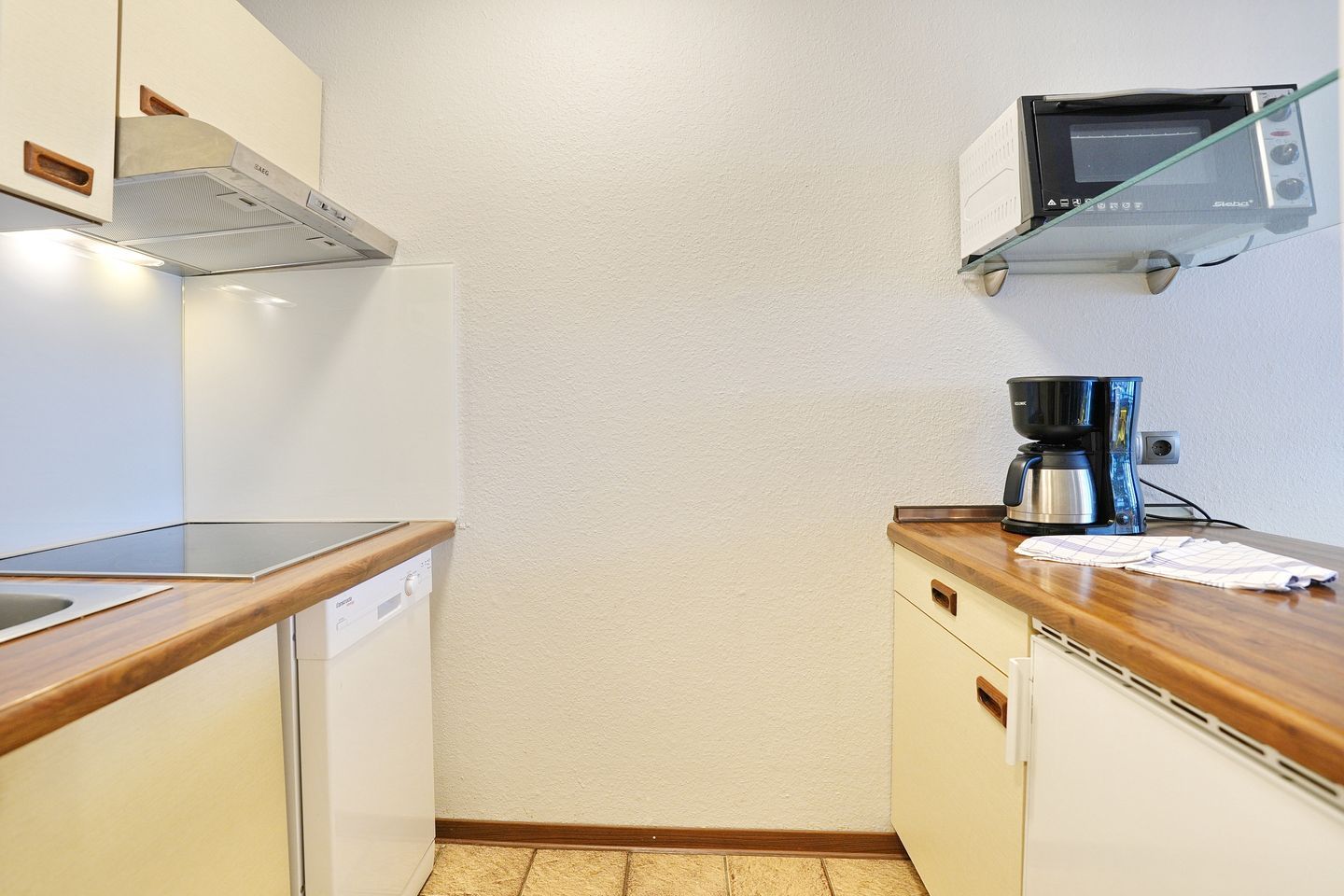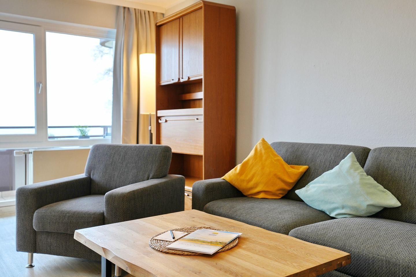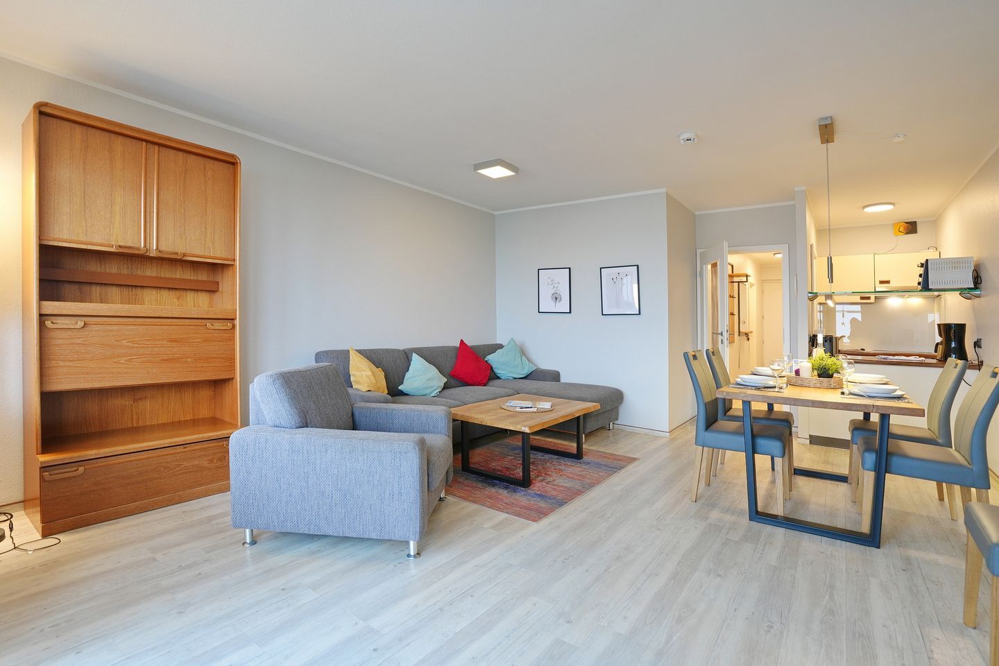 Im Wohnraum werden Sie mit einem traumhaften Blick auf die Ostsee begrüßt. Hier gibt es eine Sitzecke mit Fernseher sowie einen Eßtisch mit 5 Stühlen. Die kleine Pantryküche ist funktional mit einem 4 Platten Ceranfeld mit Dunstabzugshaube , Kühlschrank mit Gefrierfach und Spülmaschine ausgestattet.