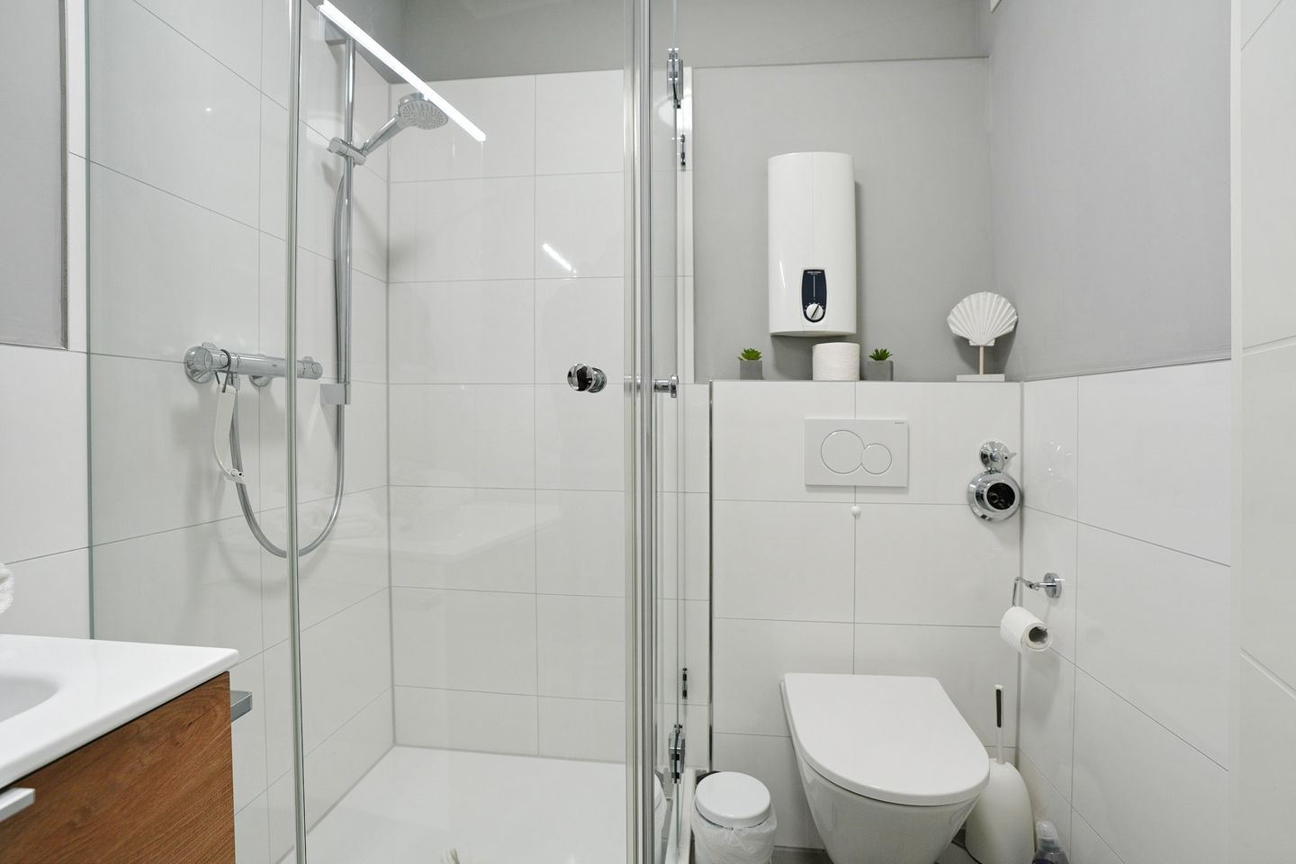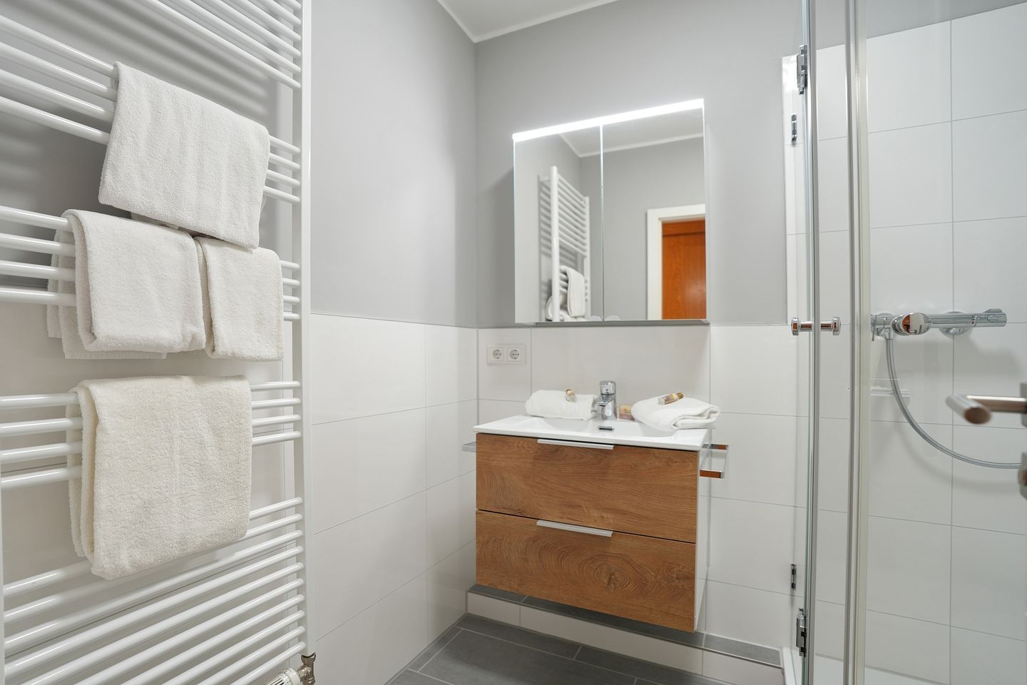 Das Duschbad ist mit einer Handtuchheizung ausgestattet. Ein Föhn ist hier auch zu finden.