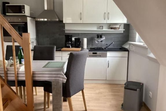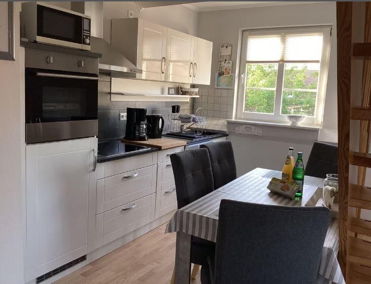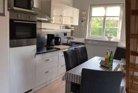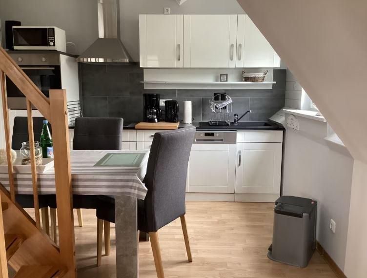 Die Wohnung verfügt über eine neu ausgestattete und großzügige offene Wohnküche, die mit allem ausgestattet ist, was man für einen angenehmen Aufenthalt benötigt. Zur Ausstattung gehören ein Geschirrspüler, eine Mikrowelle, ein E-Herd, ein Backofen, ein Toaster, ein Mixer, eine Kaffeemaschine sowie ein Wasser- und Eierkocher. Am Esstisch mit vier Stühlen können Sie gemeinsam frühstücken, essen oder den Tag in gemütlicher Runde ausklingen lassen.