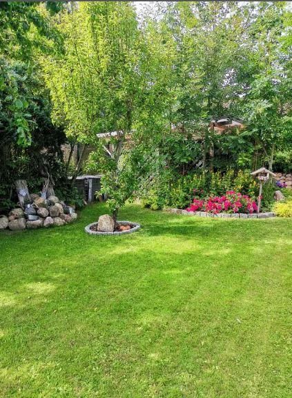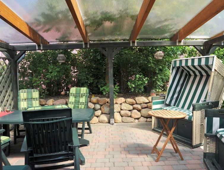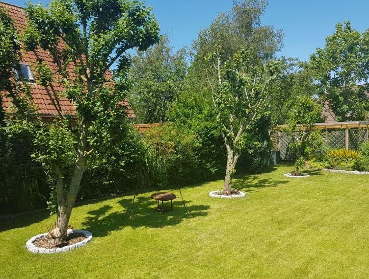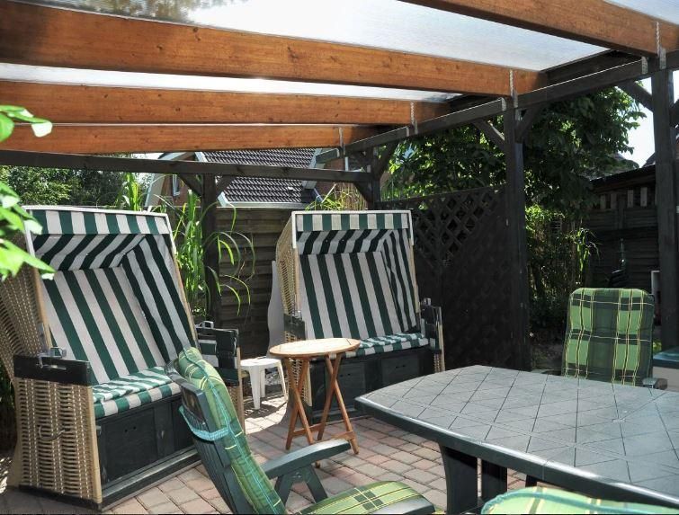 Für ausgiebige Entspannung steht Ihnen eine überdachte Terrasse mit zwei Strandkörben, Gartentisch und Stühlen zur Verfügung. Im weitläufigen Garten finden Sie außerdem eine ruhige Liegewiese mit Grillmöglichkeit sowie einigen Freizeitangebote für Groß und Klein – darunter eine Rutsche, ein Trampolin und bequeme Gartenmöbel.