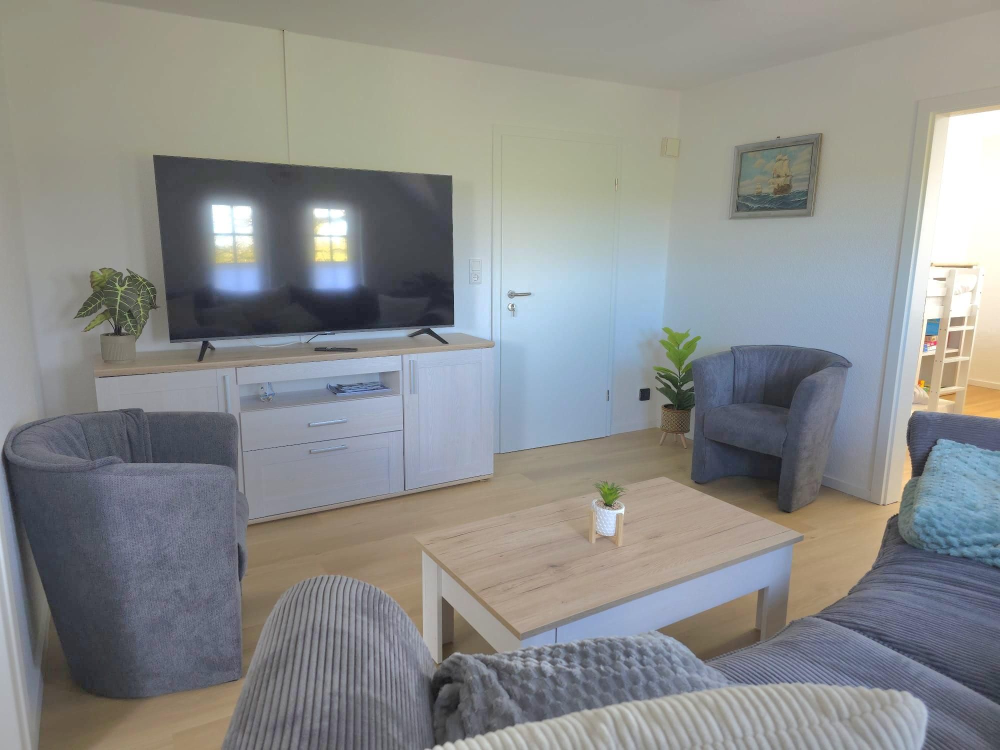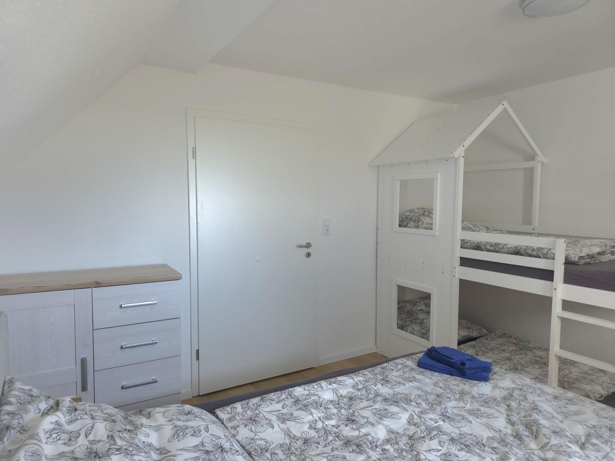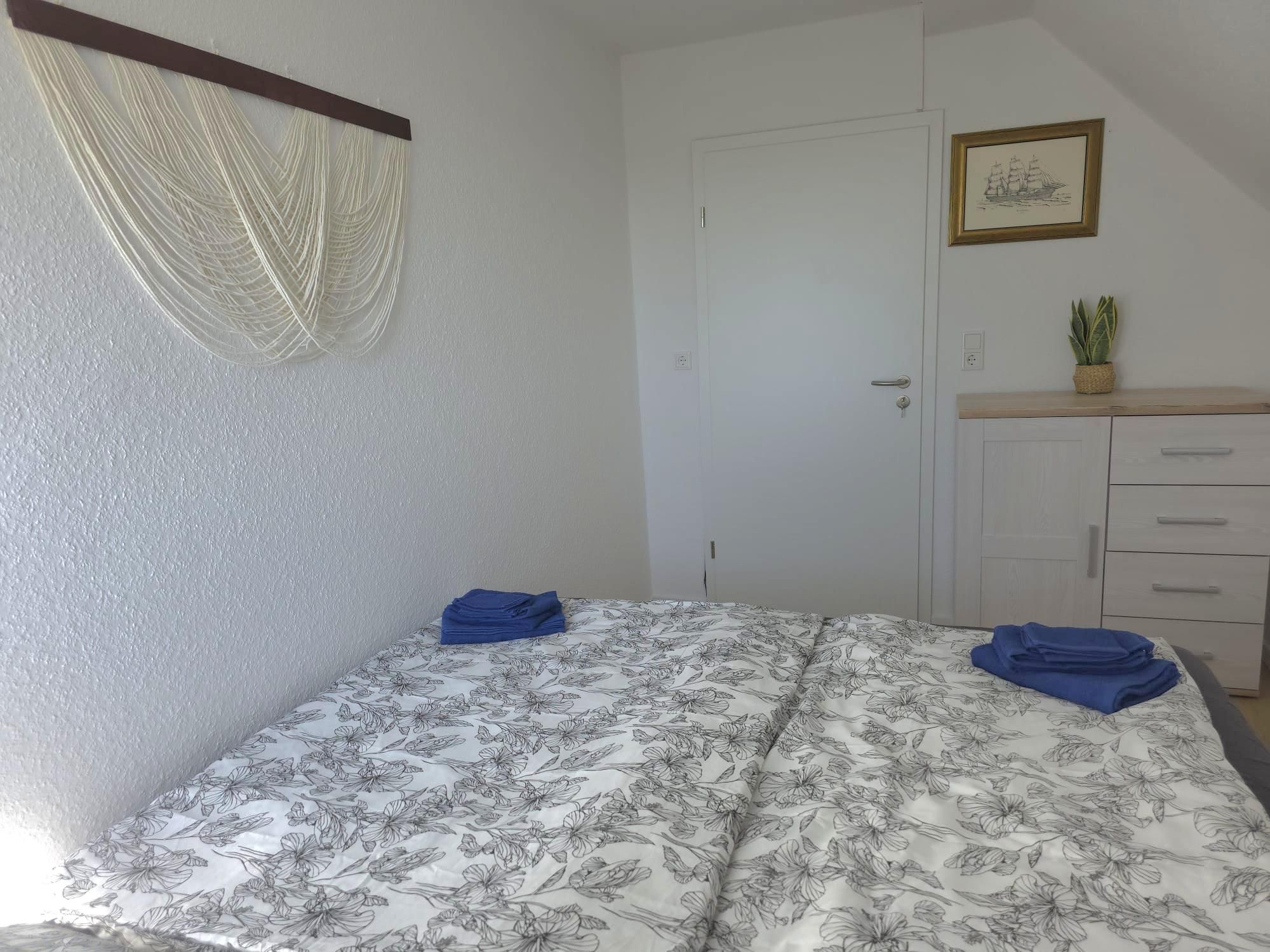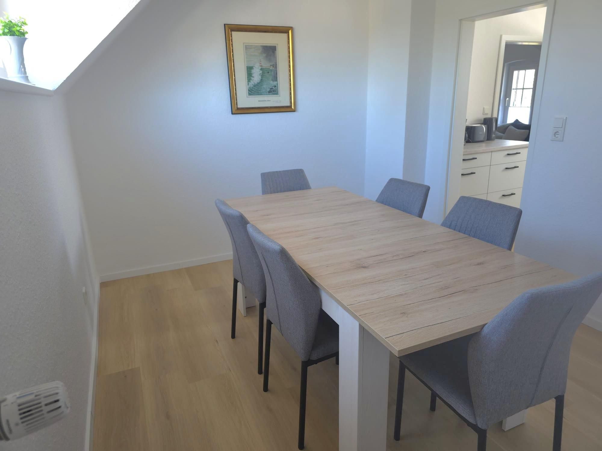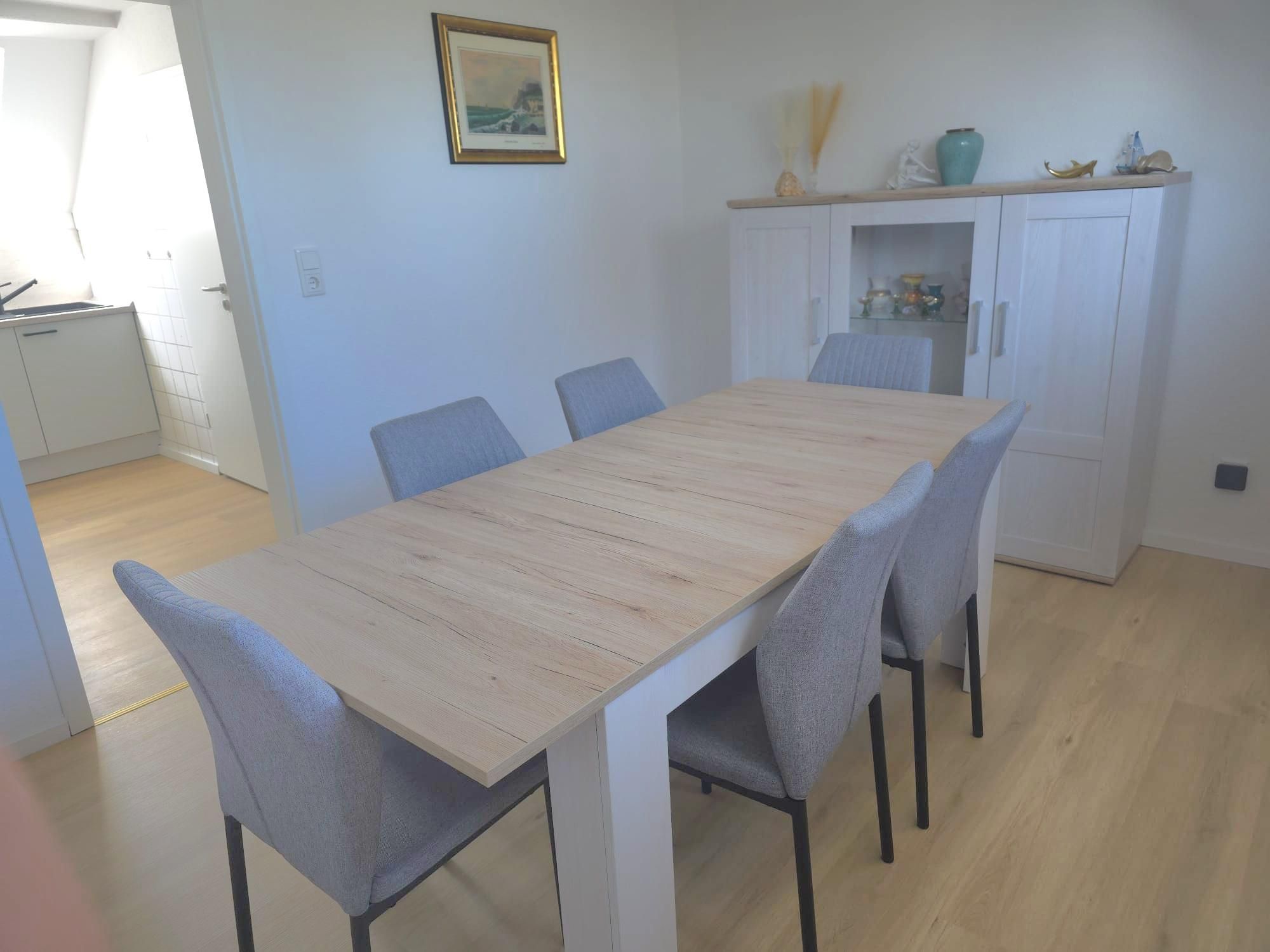 Die Ausstattung ist sehr modern und geschmackvoll im maritimen Flair mit viel Liebe zum Detail nach einer umfassenden Renovierung 2026 gestaltet. Alle Möbel und das gesamte Inventar wurden 2026 eingerichtet. An Komfort fehlt dem Urlauber hier nichts. Ein gemütlicher Wohn- und Küchenbereich mit hochwertiger Kücheneinrichtung und Geräten, ein modernes Bad mit Dusche und natürlich auch zwei liebevoll eingerichtete Schlafzimmer mit guten Boxspringbetten für die schönsten Träume gehören genauso dazu wie kostenloses WLAN. Das Kinderbett im großen Schlafzimmer ist ein Doppel-Hausbett, was Kinderherzen schneller schlagen lässt. Das untere Bett ist ebenerdig, sodass dort auch die Kleinsten schlafen können. Eine kleine Spielecke mit einer Auswahl an Spielsachen, Puzzles und Büchern soll den kleinen Urlaubern ebenfalls Freude bereiten. Im hellen Esszimmer ist viel Platz für bis zu sechs Personen.