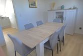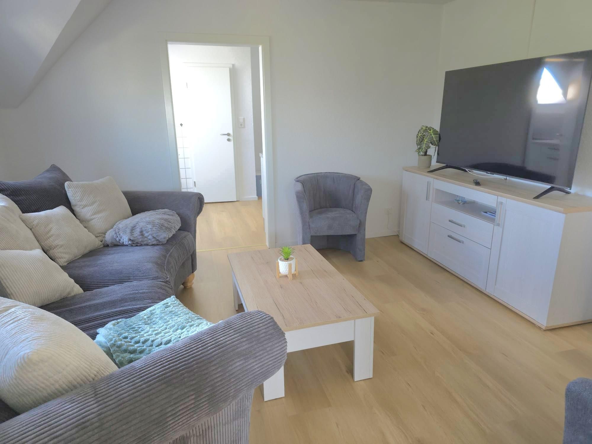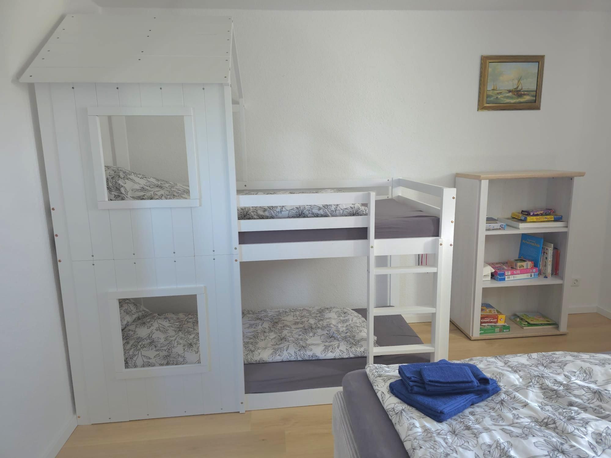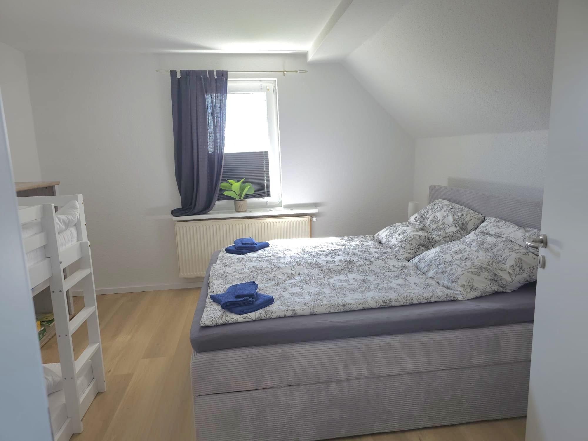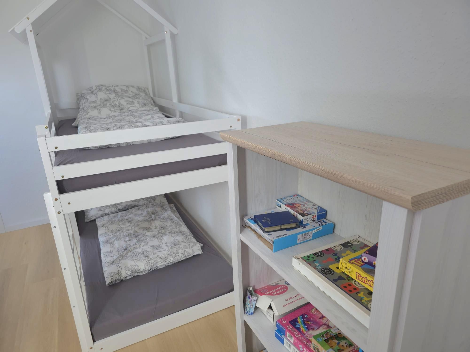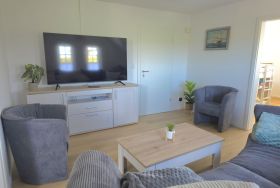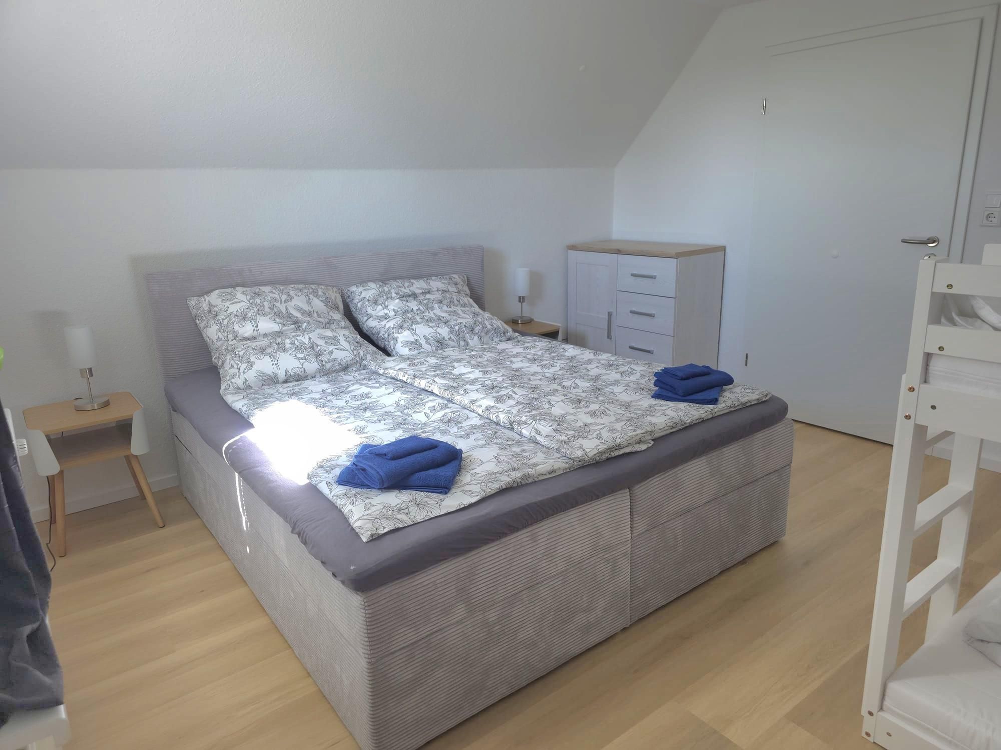 Die Ausstattung ist sehr modern und geschmackvoll im maritimen Flair mit viel Liebe zum Detail nach einer umfassenden Renovierung 2026 gestaltet. Alle Möbel und das gesamte Inventar wurden 2026 eingerichtet. An Komfort fehlt dem Urlauber hier nichts. Ein gemütlicher Wohn- und Küchenbereich mit hochwertiger Kücheneinrichtung und Geräten, ein modernes Bad mit Dusche und natürlich auch zwei liebevoll eingerichtete Schlafzimmer mit guten Boxspringbetten für die schönsten Träume gehören genauso dazu wie kostenloses WLAN. Das Kinderbett im großen Schlafzimmer ist ein Doppel-Hausbett, was Kinderherzen schneller schlagen lässt. Das untere Bett ist ebenerdig, sodass dort auch die Kleinsten schlafen können. Eine kleine Spielecke mit einer Auswahl an Spielsachen, Puzzles und Büchern soll den kleinen Urlaubern ebenfalls Freude bereiten. Im hellen Esszimmer ist viel Platz für bis zu sechs Personen.