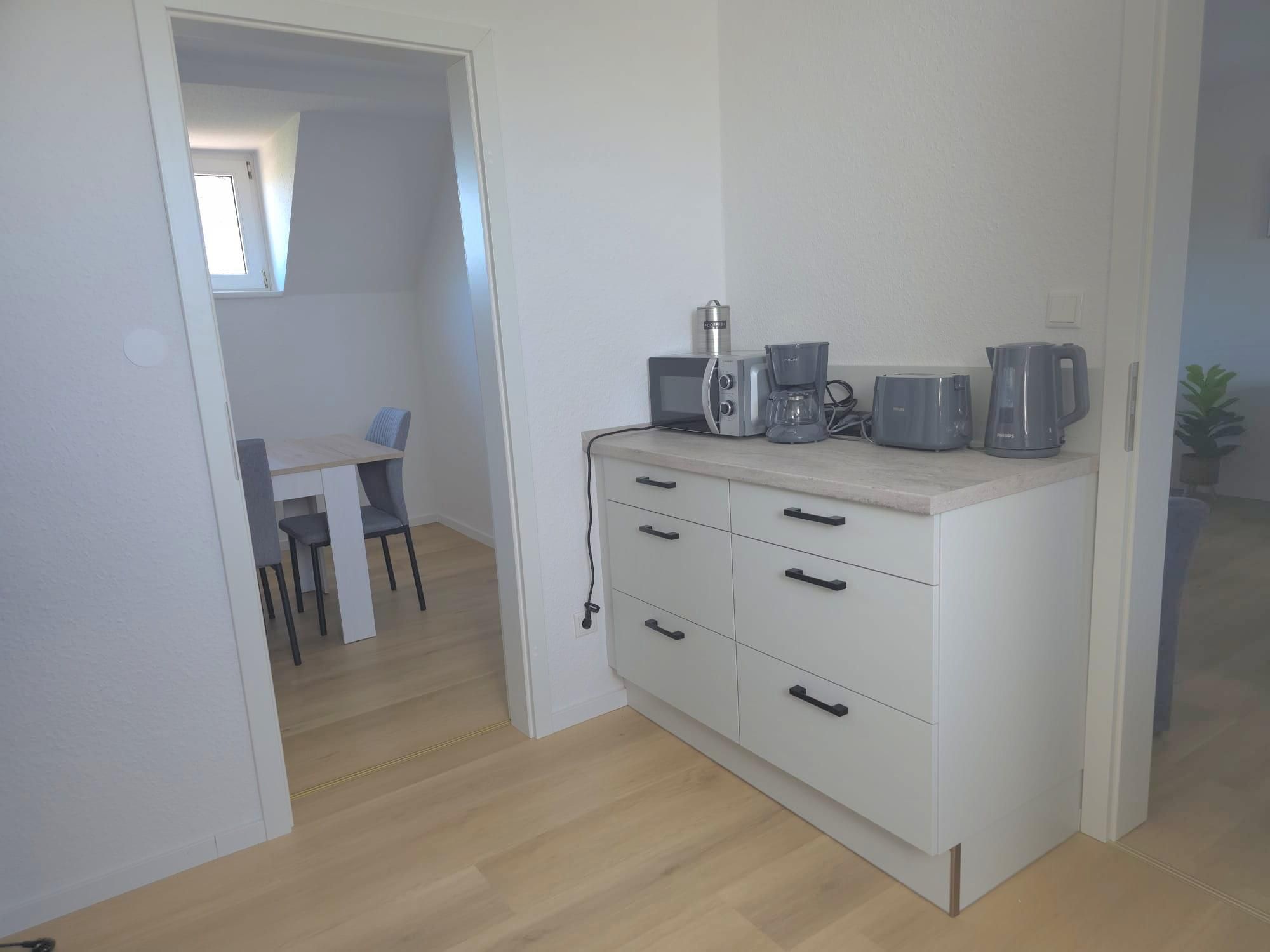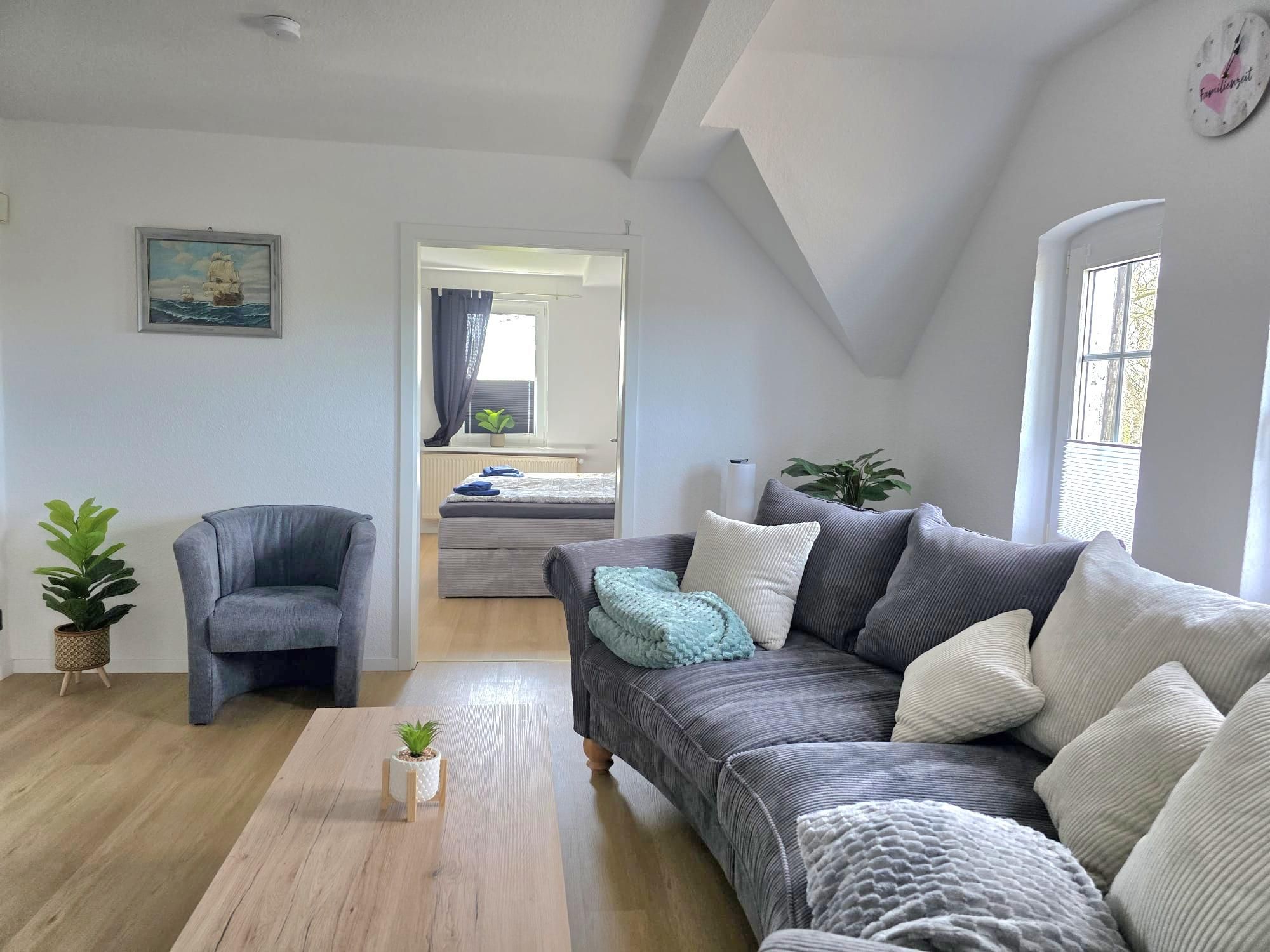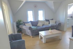 Die maritim eingerichtete Feriewohnung im Obergeschoss mit Wohn-/Küchenbereich, 2 Schlafzimmer für die ganze Familie, Bad mit Dusche und einem Esszimmer bietet genug Platz für Erholung und Tapetenwechsel. Aber auch für Homeoffice -mal wo anders- ist hier ein toller Ort mit WLAN.