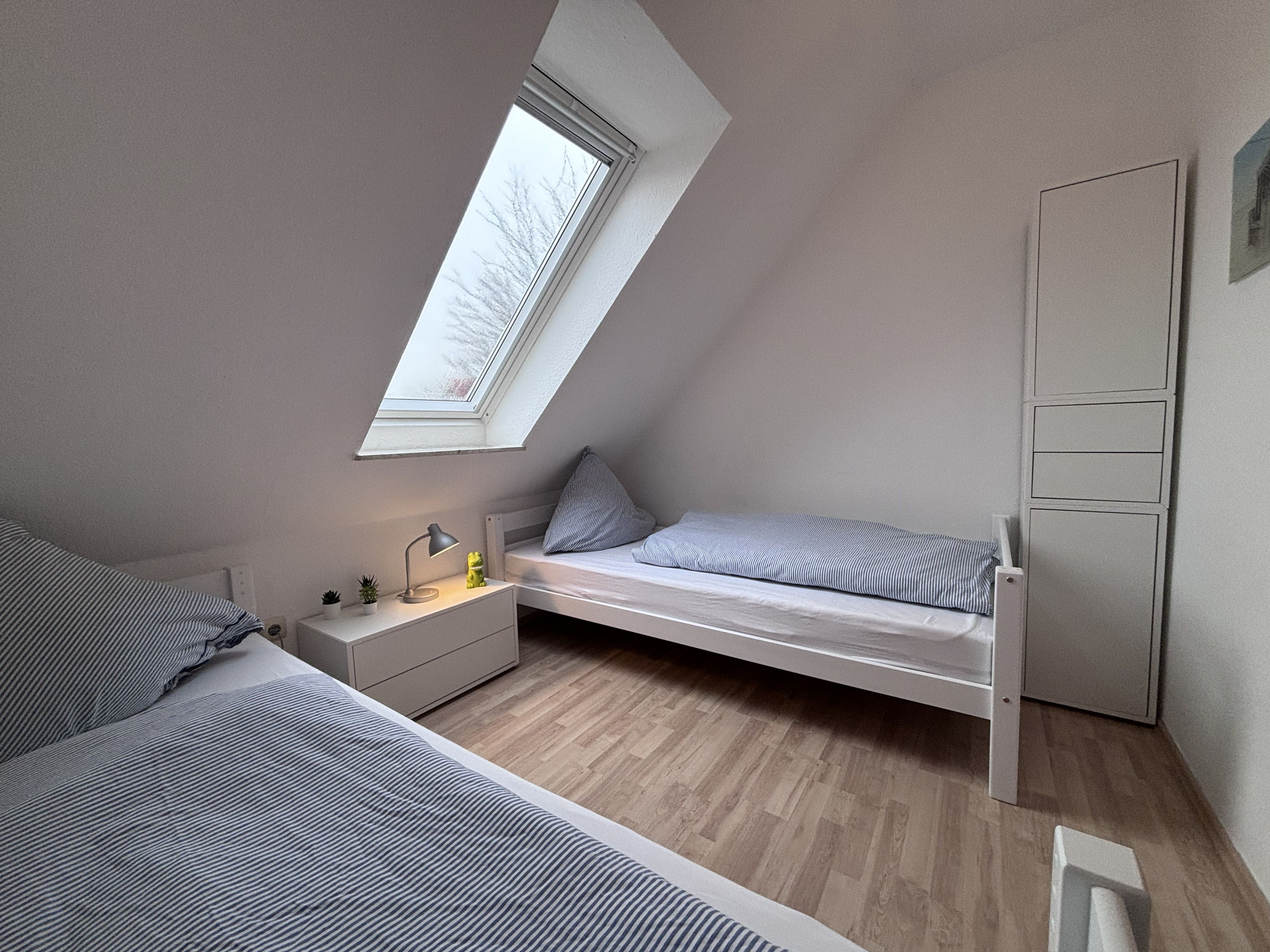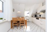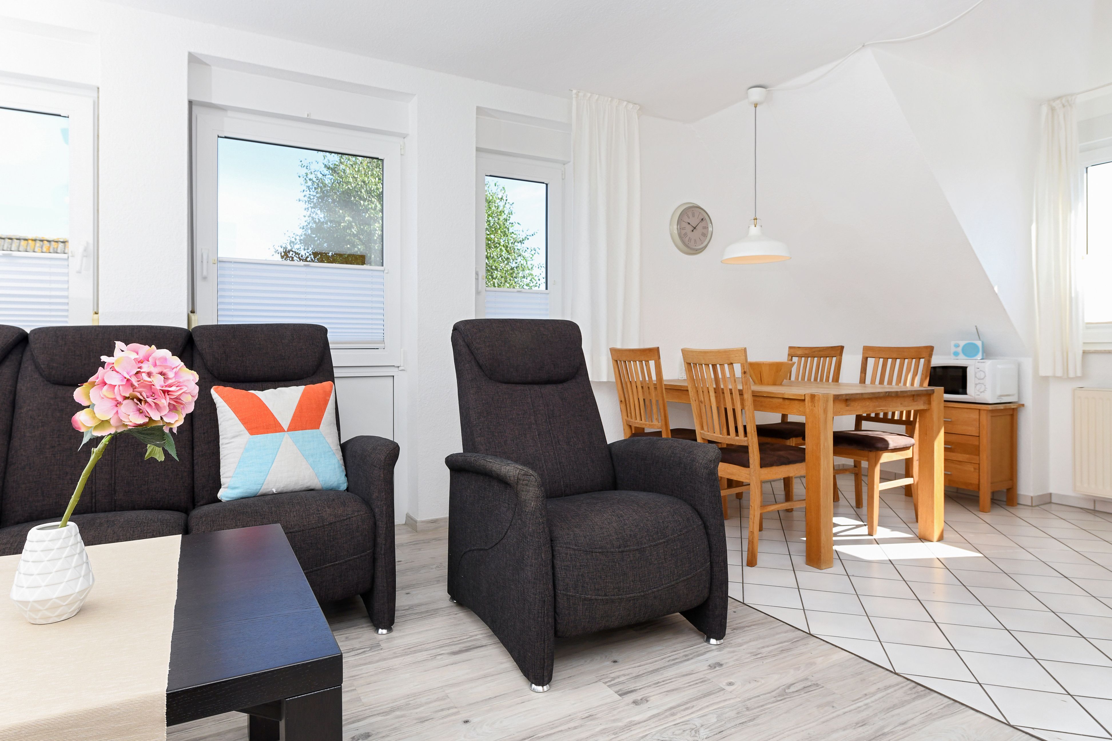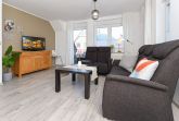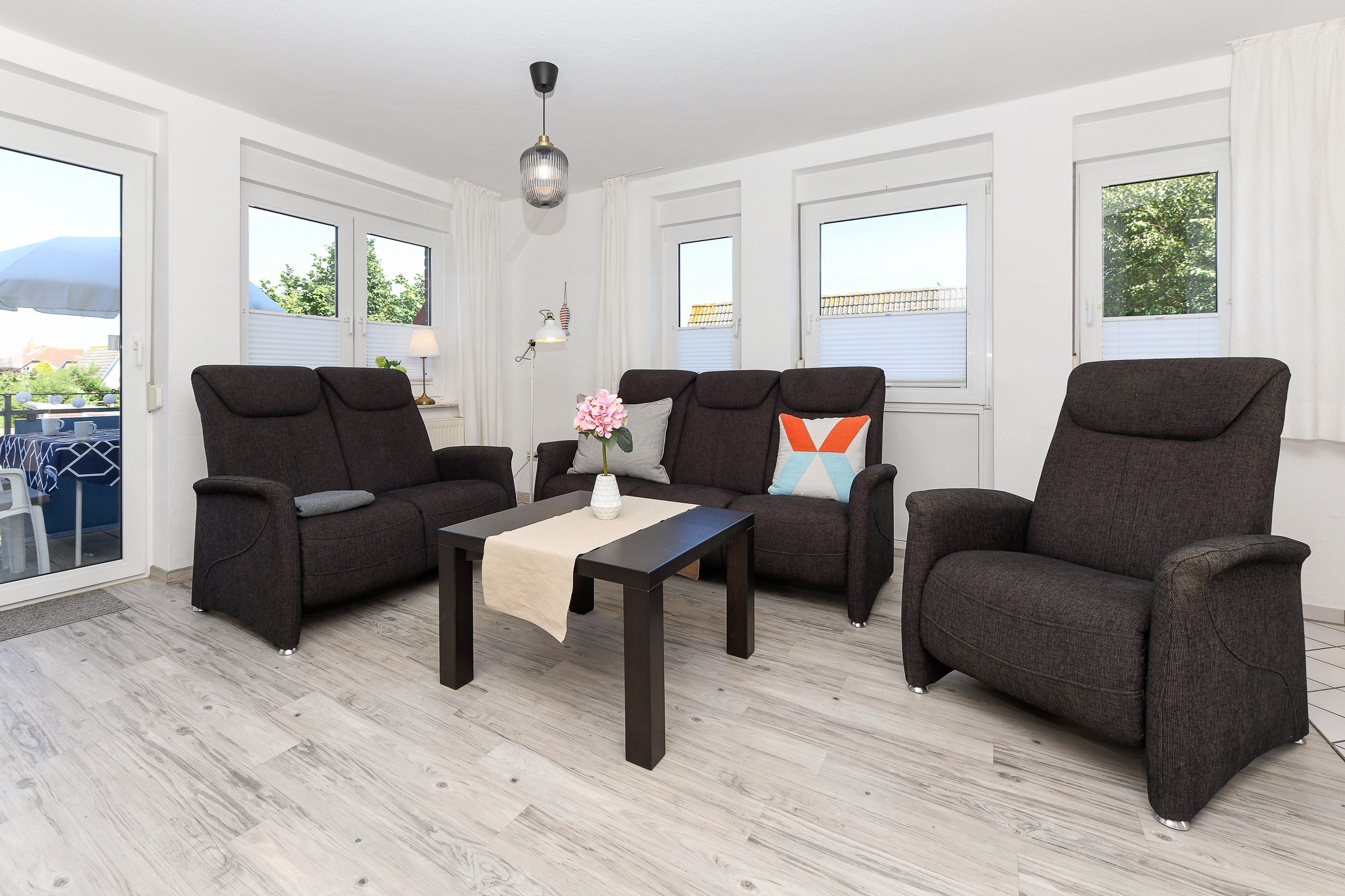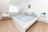 Die Ferienwohnung im ersten Obergeschoss bietet einen großzügigen, geschmackvoll eingerichteten Wohnbereich mit direktem Zugang zum Balkon sowie eine offene, moderne Küche mit Essbereich. Zudem stehen neben einem Badezimmer mit Dusche und WC zwei Schlafzimmer zur Verfügung. Eines mit einem Doppelbett, das andere mit zwei Einzelbetten.