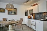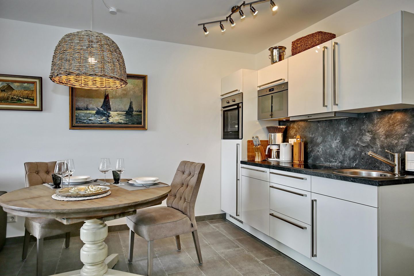 Die exklusive Küchenzeile ist unter anderem mit einem Geschirrspüler, einer Mikrowelle, einem vierfachen Cerankochfeld, einem Backofen sowie einem Kühlschrank mit Gefrierfach voll ausgestattet. Ein Toaster, ein Wasserkocher und eine Filterkaffeemaschine komplettieren die Kücheneinrichtung.