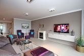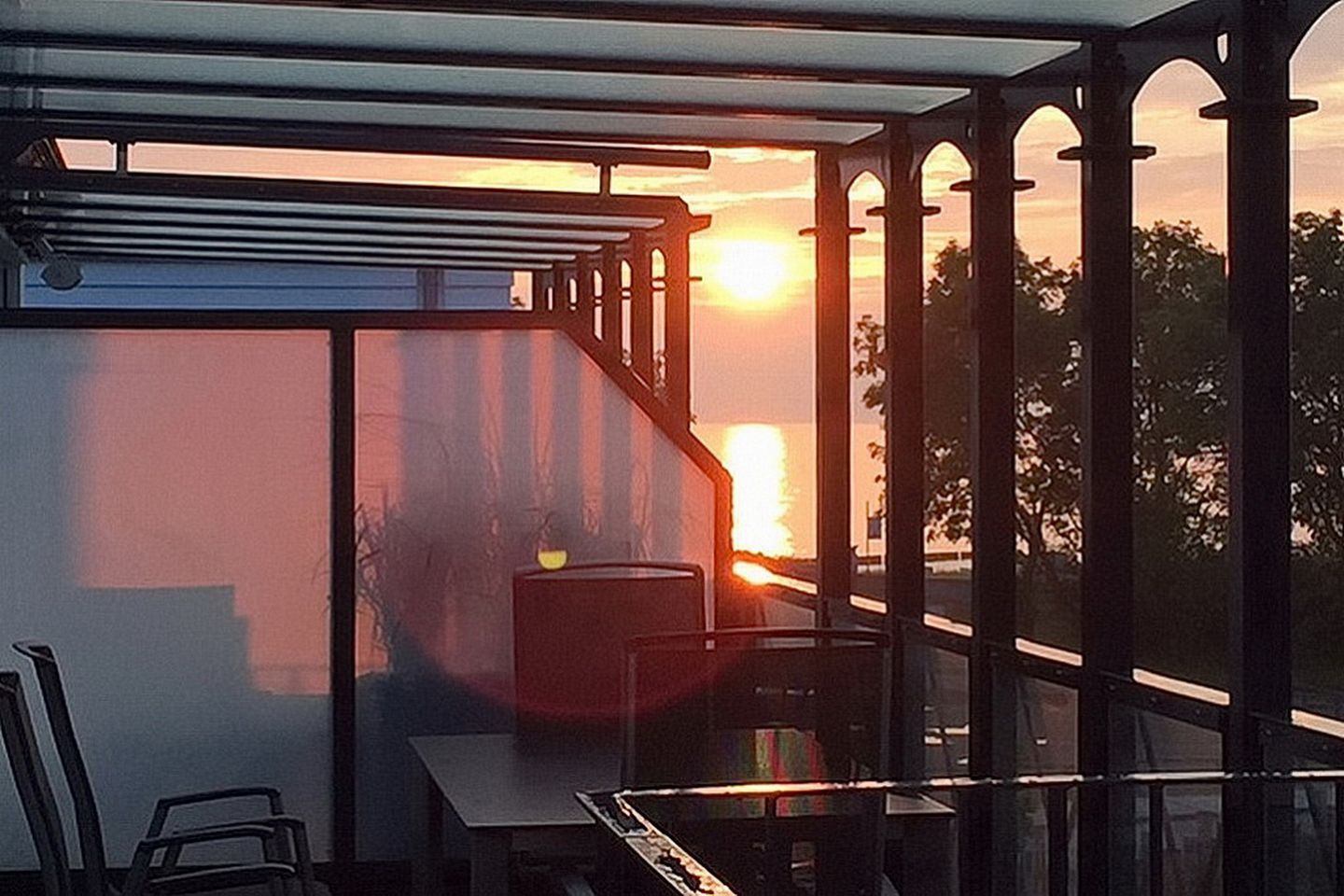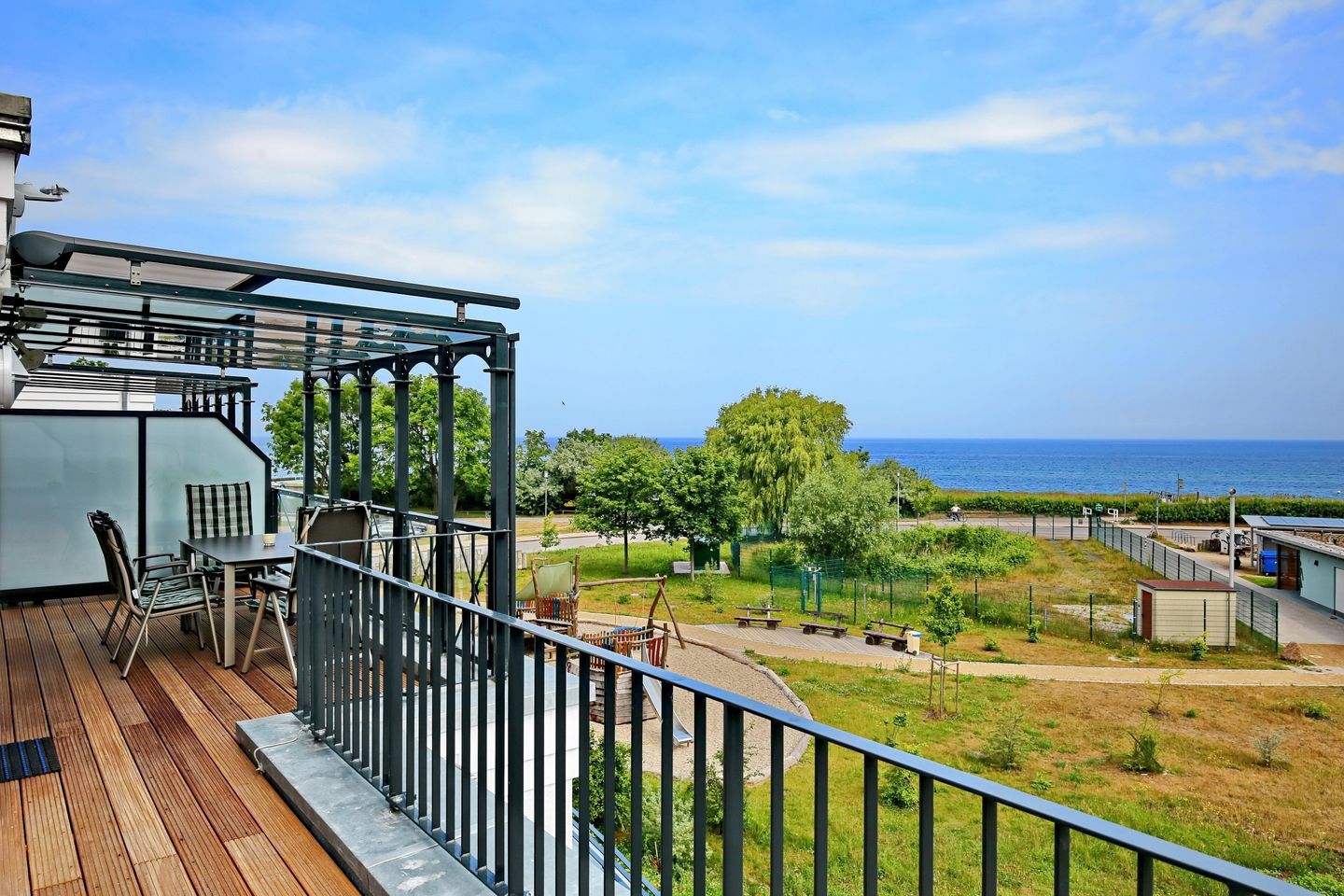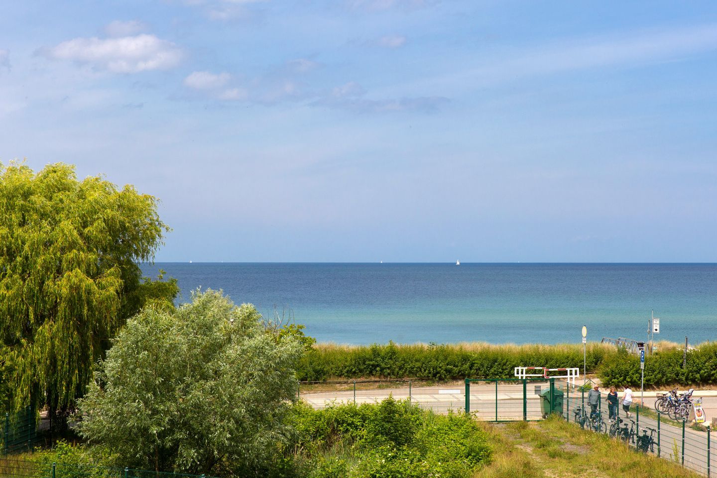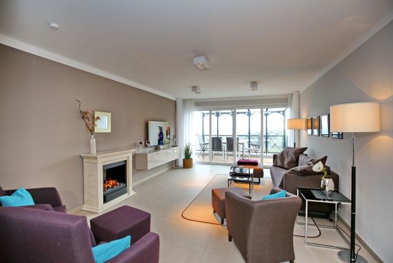 Der großzügige Wohnbereich mit bodentiefen Fenstern garantiert mit einer behaglichen Couch, einem Elektro-Kamin sowie einem Flatscreen-TV und einem Blu-Ray-Player gesellige Abende. Gern können Sie den kostenlosen WLAN-Zugang des Hauses nutzen. Die Fensterfront lässt sich durch Schiebetüren öffnen und gewährt Ihnen hier den Zugang zur überdachten und beheizten Dachterrasse mit wunderschönen Ostseeblick.