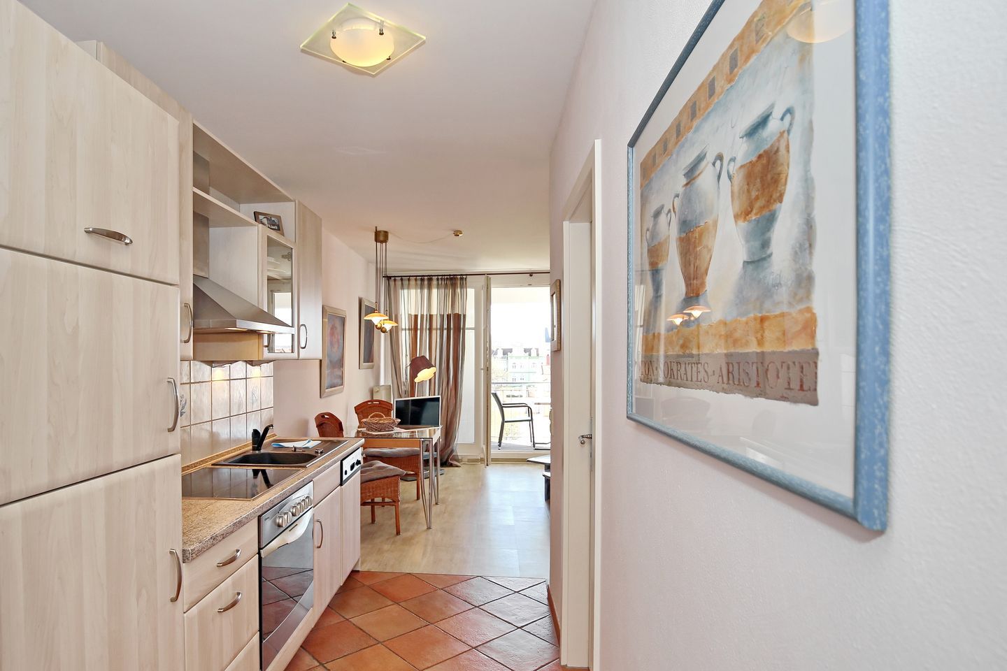Die angrenzende Küchenzeile ist mit Geschirrspüler, Kühlschrank mit Gefrierfach und einem Herd mit 4-Platten-Cerankochfeldern gut ausgestattet. Natürlich stehen dir ein Toaster, eine Kaffeemaschine und ein Wasserkocher zur Verfügung.