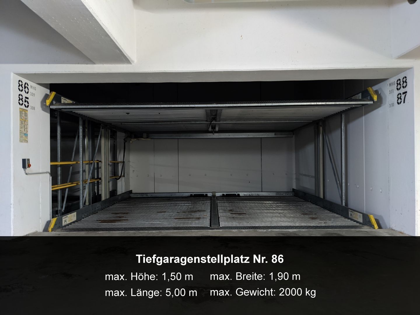 Zu jeder Wohnung gehört ein Tiefgaragenstellplatz für serienmäßige Fahrzeuge ohne Sportausführung (tiefergelegt, Spoiler, Niederquerschnittreifen). In der Tiefgarage gibt es außerdem Ablagefächer für Dachboxen. Beachten Sie bitte die max. zulässigen Pkw-Maße und Höchstgewichte: