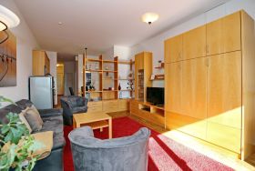 Im Schlafzimmer verspricht dir ein Doppelbett erholsamen Schlaf. Für dein Gepäck kannst du den großen Kleiderschrank nutzen (das Schlafzimmerfenster geht zum Atrium raus). Ein Schrankbett verwandelt den Wohnbereich unkompliziert in einen Schlafbereich für 2 Personen. Die Fenster kannst du mit Vorhängen verdunkeln.