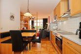Die zum Wohnbereich angrenzende Küchenzeile ist für dich mit einem Kühlschrank mit Gefrierfach, einem Geschirrspüler, einer Mikrowelle sowie einem Ceranfeld mit 4 Kochmöglichkeiten und Backofen voll ausgestattet. Ein Toaster, eine Filterkaffeemaschine und ein Wasserkocher fehlen hier selbstverständlich nicht. Der Essbereich ist als Sitzecke im Küchenbereich integriert.