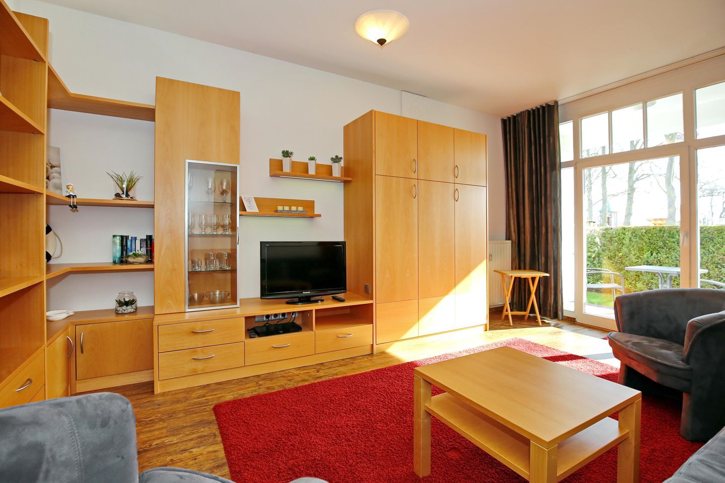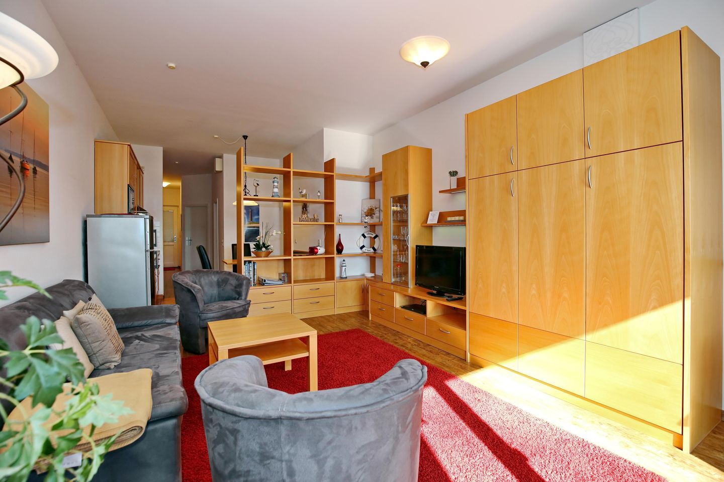 Im Wohnbereich der Ferienwohnung laden dich ein gemütliches Sofa, 2 Sessel und ein Flachbild-TV zu gemütlichen Fernsehabenden ein. Neben einem DVD-Player stehen dir auch ein Radio sowie ein kostenloser WLAN-Zugang (ohne Gewähr) zur Verfügung.