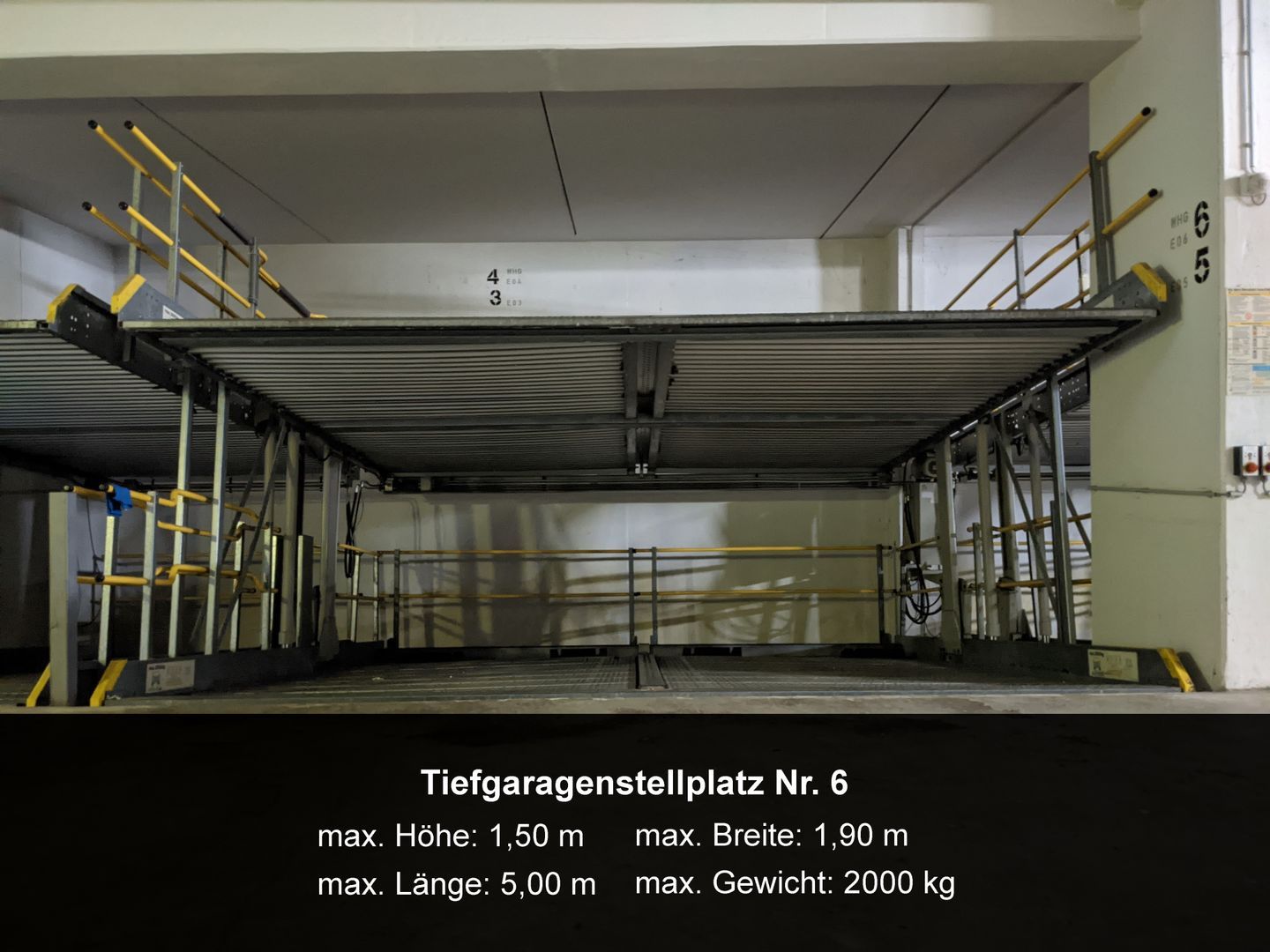 Zu jeder Wohnung gehört ein Tiefgaragenstellplatz für serienmäßige Fahrzeuge ohne Sportausführung (tiefergelegt, Spoiler, Niederquerschnittreifen). In der Tiefgarage gibt es außerdem Ablagefächer für Dachboxen. Beachten Sie bitte die max. zulässigen Pkw-Maße und Höchstgewichte: