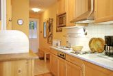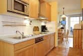 Die angrenzende Küchenzeile ist mit einem Geschirrspüler, einem Kühlschrank mit Gefrierfach, einem 2-Platten-Kochfeld und einer Mikrowelle vollständig ausgestattet. Selbstverständlich stehen Ihnen auch ein Toaster, eine Kaffeemaschine und ein Wasserkocher zur Verfügung.