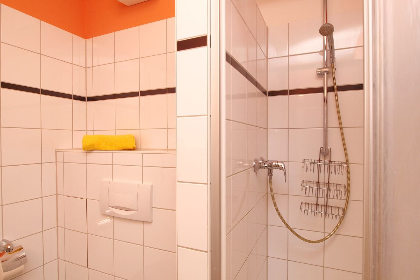 Die Ferienwohnung verfügt über ein gefliestes Duschbad mit WC, Föhn und Kosmetikspiegel.