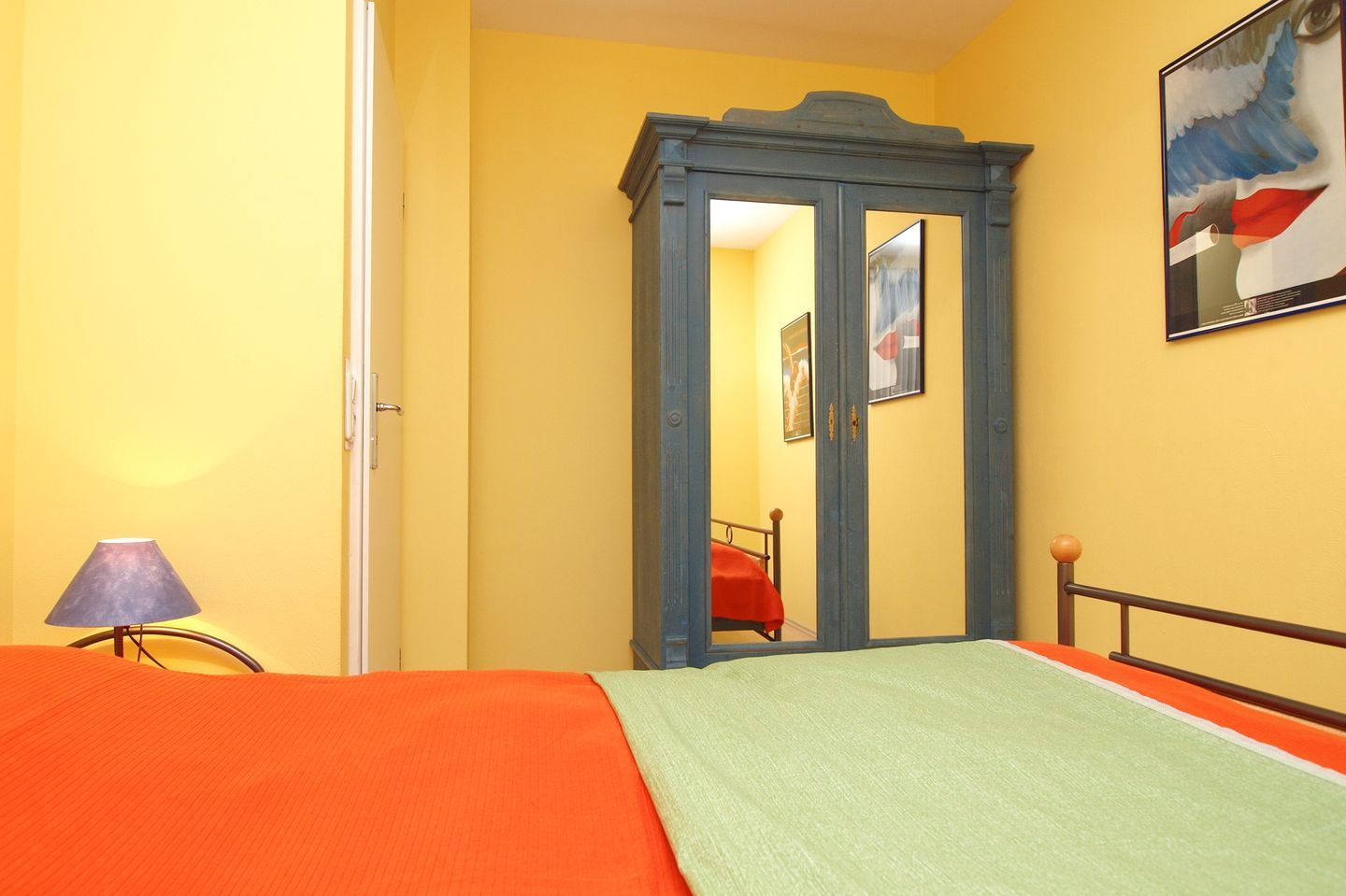 Im Schlafzimmer lädt Sie ein komfortables Doppelbett (2 x 90 x 200 cm) zu erholsamem Schlaf ein. Ein Rollo sowie Vorhänge dienen der Verdunkelung. Ein Kleiderschrank bietet ausreichend Stauraum (das Schlafzimmerfenster geht zum Atrium hinaus).