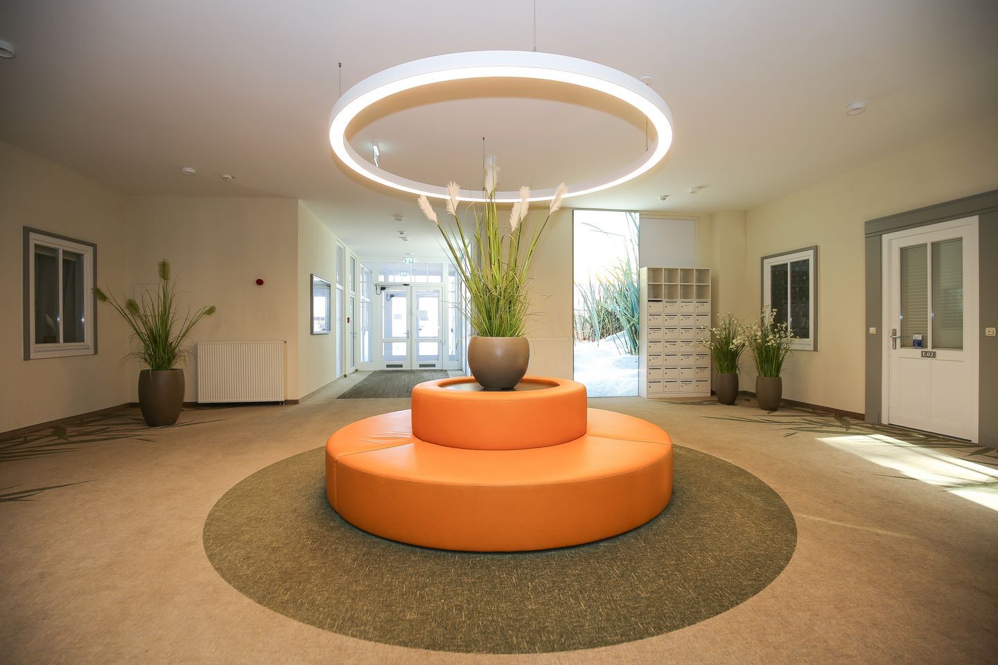 Das Haus Meeresblick, in Kühlungsborn West, liegt unmittelbar an der Strandpromenade und bietet einen direkten Zugang zum Ostseestrand. Über ein großzügiges, überdachtes Atrium mit echten Grünpflanzen, erreichen Sie die Ferienwohnungen über die Treppe oder die zwei gläsernen Fahrstühle. Der Südeingang des Hauses ermöglicht einen barrierefreien Zugang. Über den Nordeingang kommen Sie auf kurzem Weg zum Strand. Allen Gästen stehen ein Fahrradabstellraum, Münzwaschmaschinen und Münztrockner zur Verfügung.