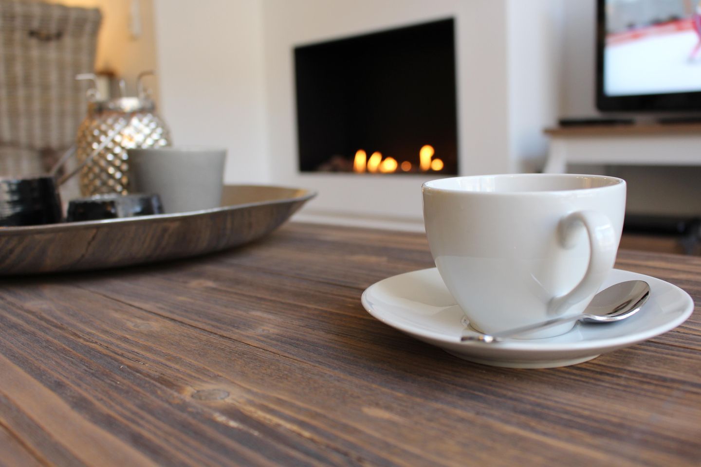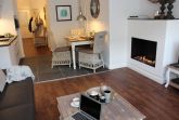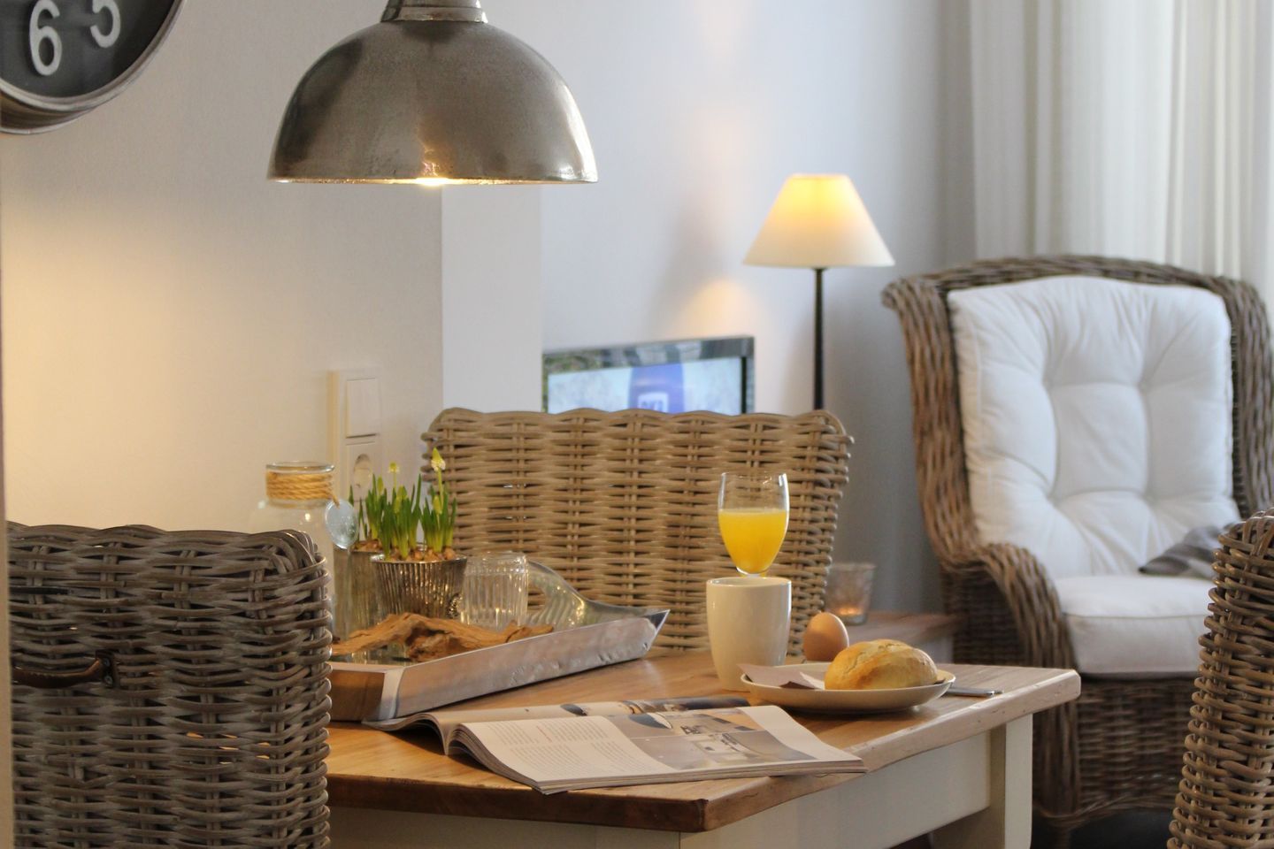 Im Wohnbereich laden eine bequeme Couch und ein Korbsessel zu entspannten Abenden ein. Für eine besonders gemütliche Atmosphäre sorgt der Gaskamin. Zu Ihrer Unterhaltung stehen ein Flachbild-TV, ein Blu-ray-Player sowie ein kostenloser WLAN-Anschluss (ohne Gewähr) zur Verfügung. Der Essbereich schließt sich direkt an den Wohnbereich an und bietet ausreichend Platz für gemeinsame Mahlzeiten.