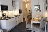 Die exklusive Küchenzeile der Ferienwohnung ist umfassend ausgestattet und lässt mit einem Toaster, einem hoch eingebauten Backofen, einer Mikrowelle, einem Wasserkocher, einer Filterkaffeemaschine, einem 4-Zonen-Cerankochfeld, einem Geschirrspüler sowie einem Kühlschrank mit Gefrierfach keine Wünsche offen.