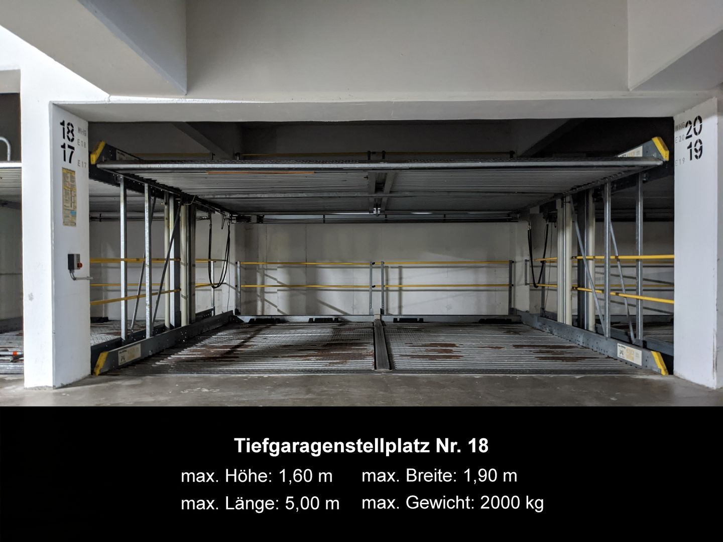 Zu jeder Wohnung gehört ein Tiefgaragenstellplatz für serienmäßige Fahrzeuge ohne Sportausführung (tiefergelegt, Spoiler, Niederquerschnittreifen). In der Tiefgarage gibt es außerdem Ablagefächer für Dachboxen. Beachten Sie bitte die max. zulässigen Pkw-Maße und Höchstgewichte: