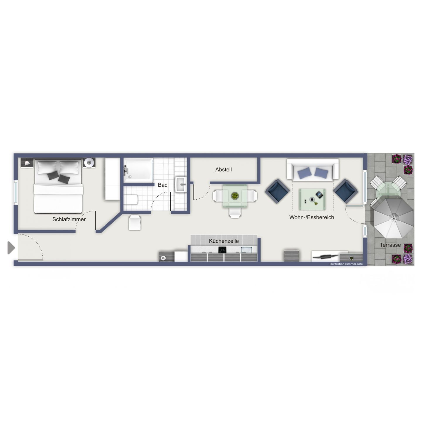 Die stilvolle und moderne 2-Zimmer-Ferienwohnung für bis zu 4 Personen befindet sich auf der Westseite des Hauses. Auf der Terrasse können Sie die Nachmittagssonne sowie einen seitlichen Teilseeblick genießen. Mit einer Größe von 45 m² bietet Ihnen die Erdgeschosswohnung mit Wohn- und Essbereich, einem Schlafzimmer, einem Duschbad sowie einer Küchenzeile viel Platz für einen erholsamen Ostseeurlaub. Die Entfernung zum Strand beträgt etwa 50 Meter.