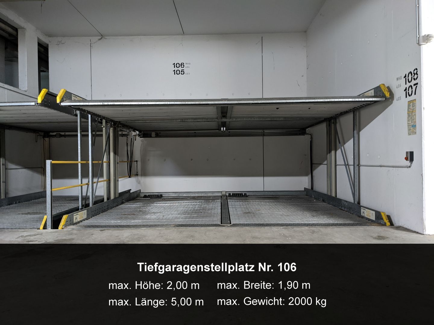 Zu jeder Wohnung gehört ein Tiefgaragenstellplatz für serienmäßige Fahrzeuge ohne Sportausführung (tiefergelegt, Spoiler, Niederquerschnittreifen). In der Tiefgarage gibt es außerdem Ablagefächer für Dachboxen. Beachten Sie bitte die max. zulässigen Pkw-Maße und Höchstgewichte: