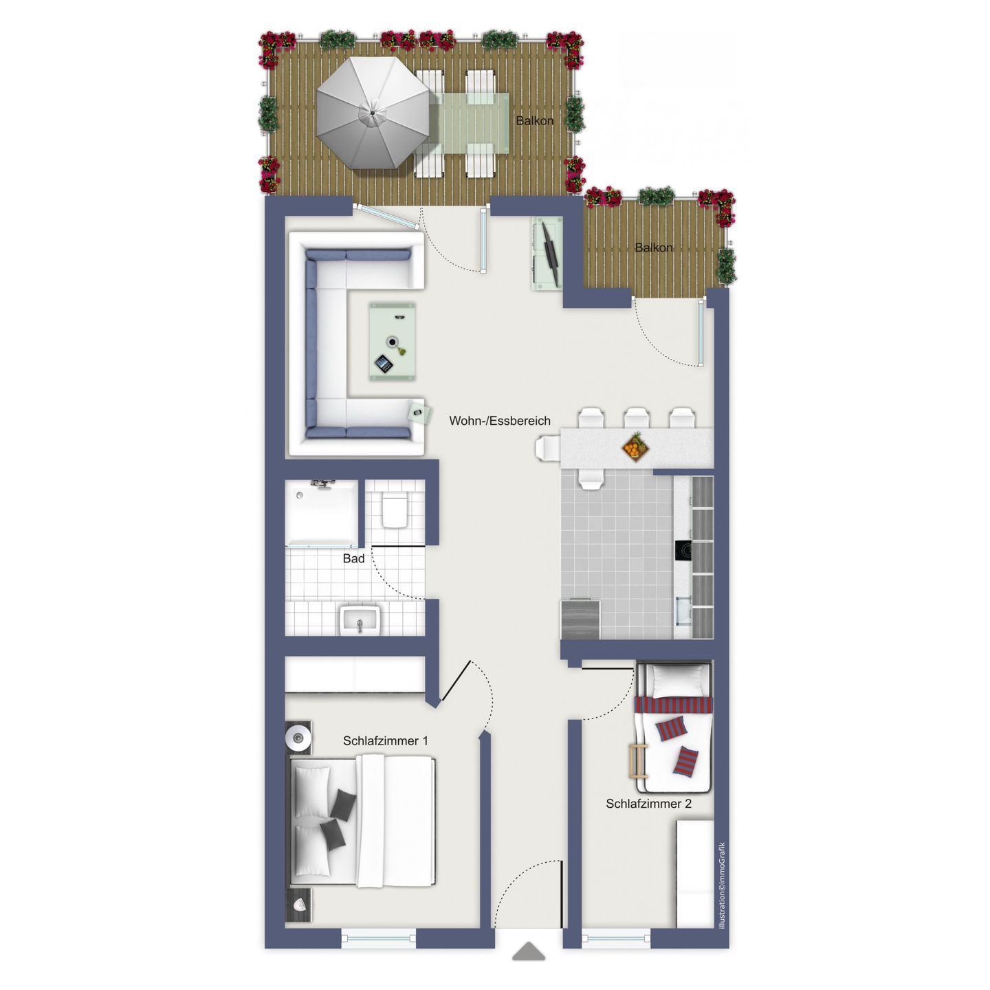 Die Ferienwohnung 404 in der Ferienanlage Meeresblick ist eine 3-Zimmer-Wohnung für bis zu 4 Personen.