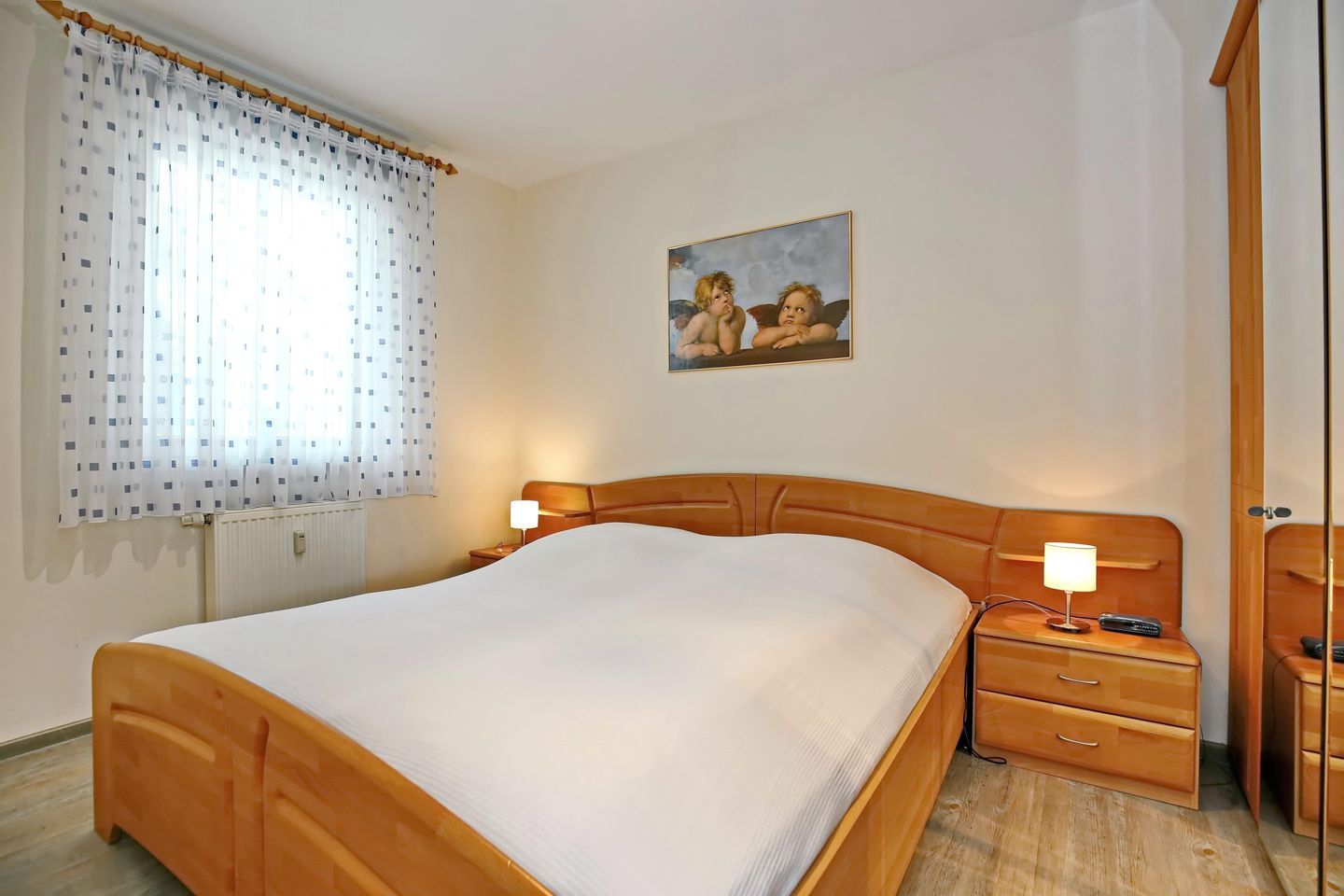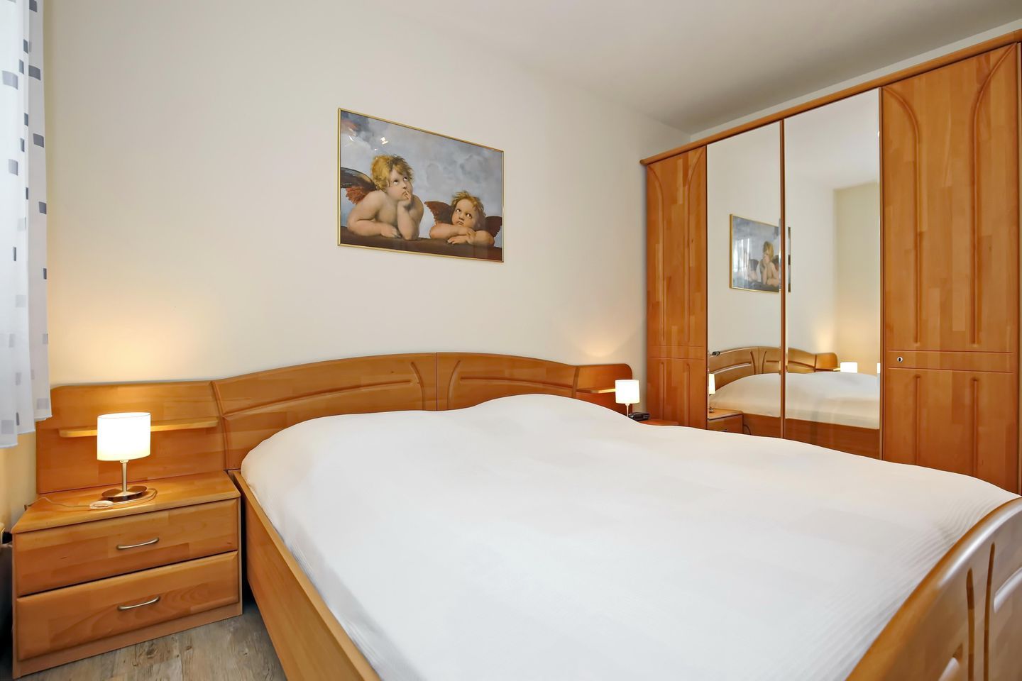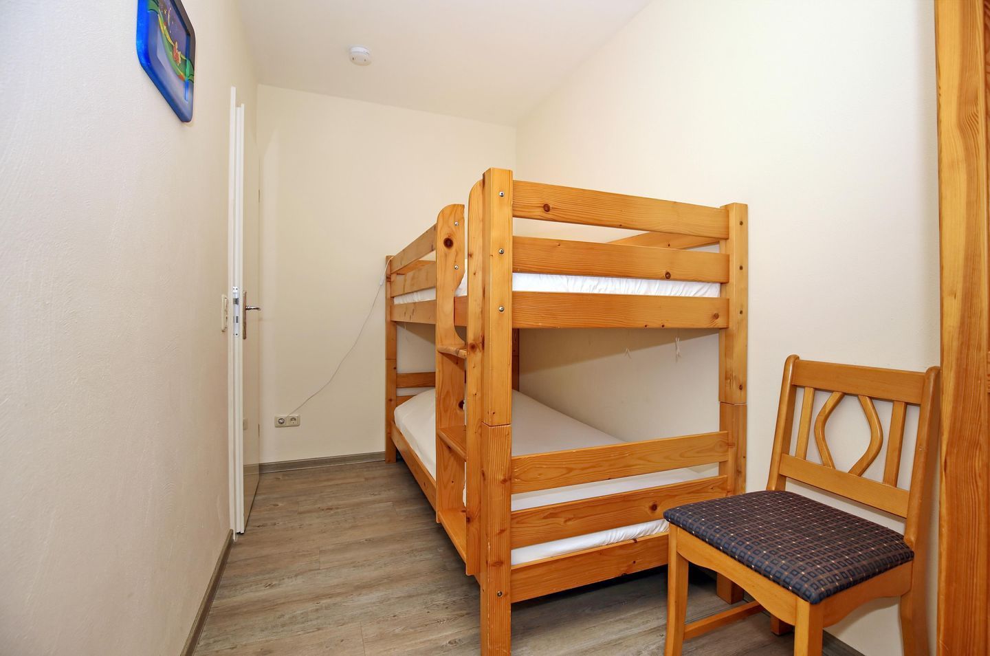 Im ersten Schlafzimmer lädt ein Doppelbett (2 x 90 x 200 cm) zu erholsamem Schlaf ein. Das zweite Schlafzimmer ist mit einem Etagenbett (je 90 x 200 cm) ausgestattet. In beiden Schlafzimmern bieten Kleiderschränke viel Stauraum (die Schlafzimmerfenster beider Zimmer gehen zum Atrium hinaus).