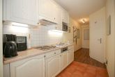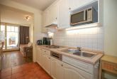 Die angrenzende Küchenzeile ist mit einem Kühlschrank mit Gefrierfach, einem Geschirrspüler, einem 4-Platten-Kochfeld und einer Mikrowelle voll ausgestattet. Natürlich stehen Ihnen ein Toaster, eine Kaffeemaschine und ein Wasserkocher zur Verfügung.