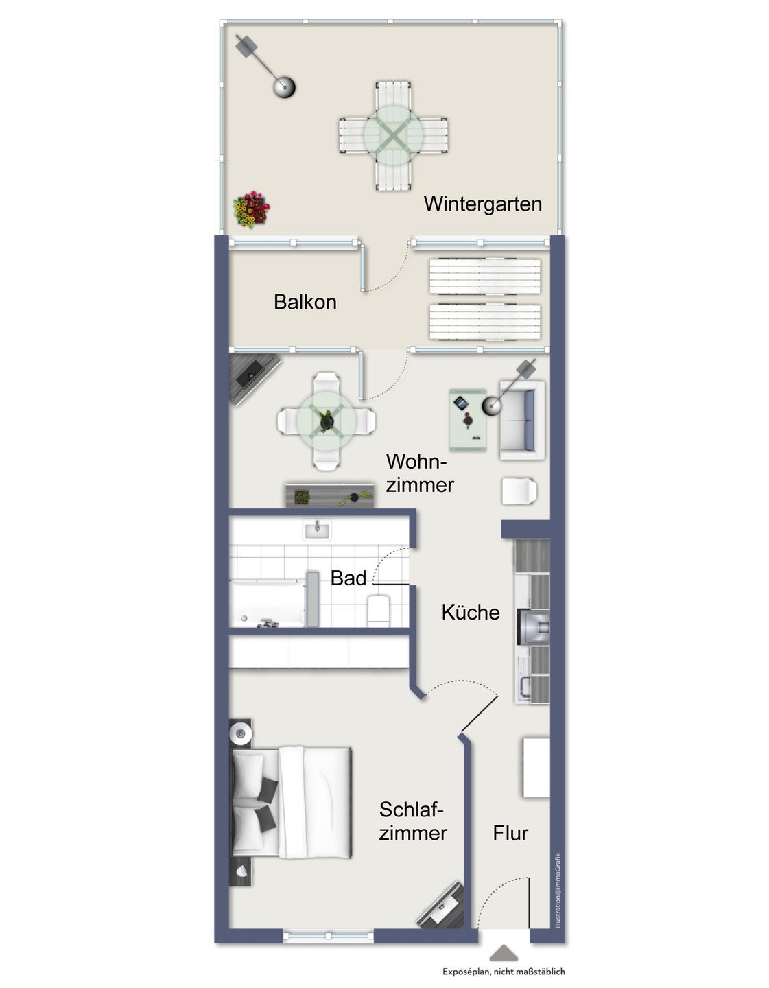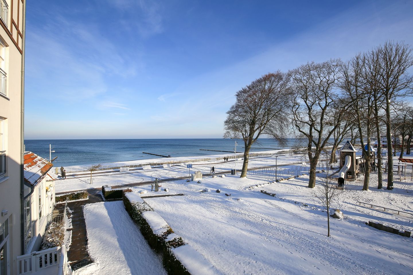 Im großzügigen Wohnraum der Ferienwohnung laden eine bequeme Doppelschlafcouch (180 x 200 cm) und ein Flachbild-TV zu geselligen Fernsehabenden ein. Vom Wohnzimmer aus gelangen Sie auf den Balkon, auf dem zwei Sonnenliegen zum Sonnenbaden einladen. Vom Balkon aus erreichen Sie wiederum die großzügige und möblierte Glasveranda. Von hier haben Sie einen Rundumblick auf die Ostsee und den Park. Die Glasveranda ist mit einer Sitzgruppe ausgestattet – ideal für gemeinsame Mahlzeiten. Hier können Sie entspannte Stunden mit Blick aufs Meer und gemütliche Abende mit Meeresrauschen genießen.