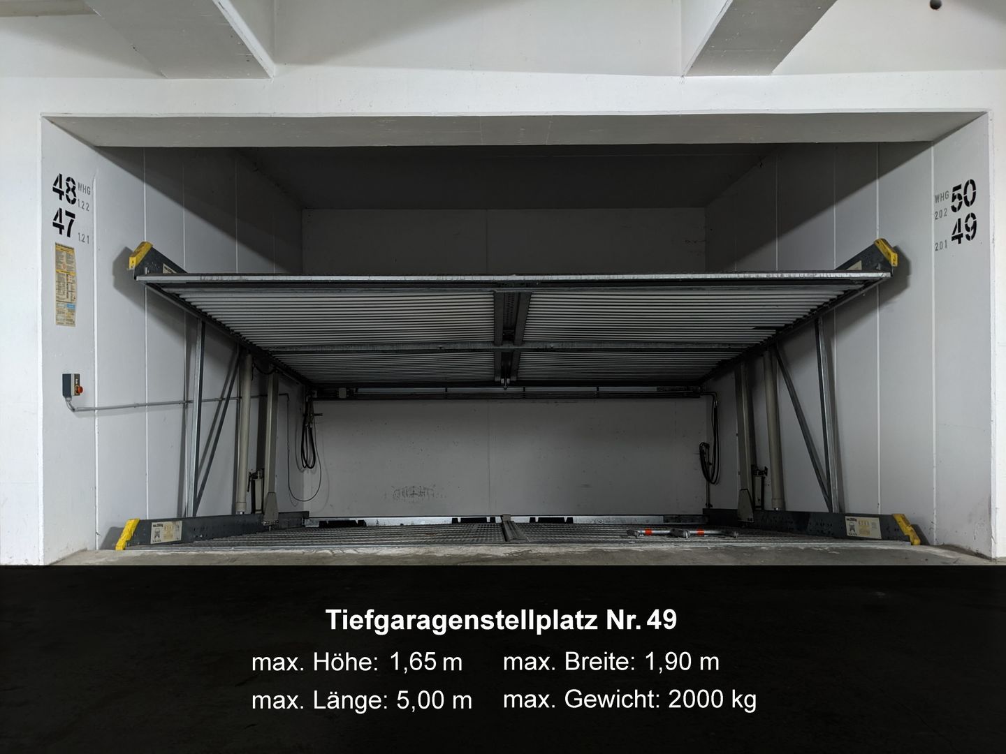 Zu jeder Wohnung gehört ein Tiefgaragenstellplatz für serienmäßige Fahrzeuge ohne Sportausführung (tiefergelegt, Spoiler, Niederquerschnittreifen). In der Tiefgarage gibt es außerdem Ablagefächer für Dachboxen. Beachten Sie bitte die max. zulässigen Pkw-Maße und Höchstgewichte: