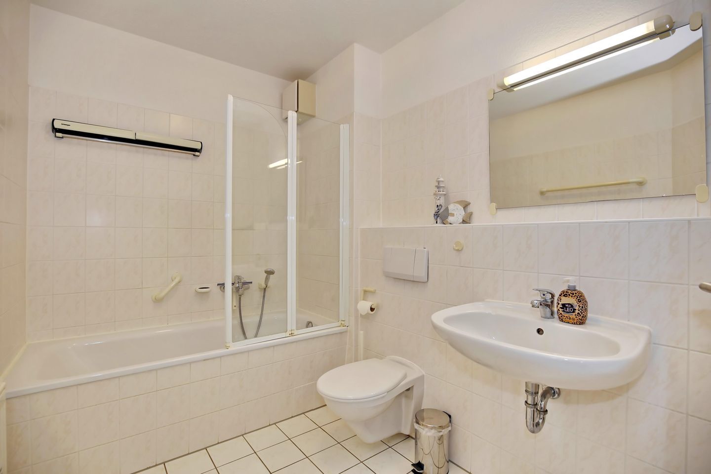Das Badezimmer ist mit einer Badewanne, einem WC und einem Föhn ausgestattet. Im Küchenbereich sowie im Badezimmer wurden Fliesen verlegt, während der restliche Fußboden mit hochwertigem Design-Vinyl ausgelegt ist.