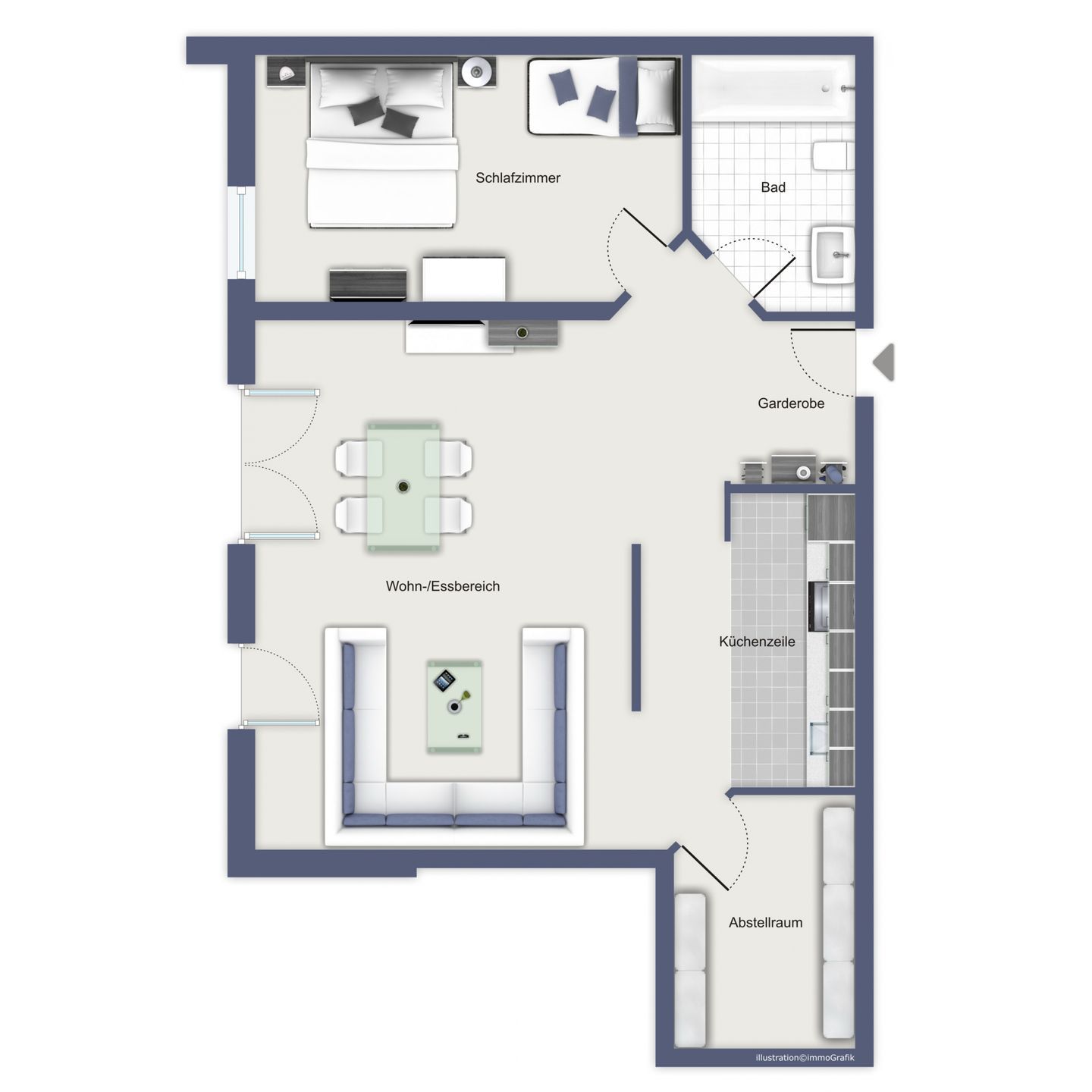 Sie wohnen hier zentral und dennoch entspannt auf 70 Quadratmetern. Ein Fahrstuhl bringt Sie bequem bis zu Ihrer Ferienwohnung im 1. Obergeschoss. Die Wohnung bietet einen großzügigen Wohnbereich mit Küchenzeile, einen Abstellraum, ein separates Schlafzimmer sowie ein Badezimmer. Zum feinen Sandstrand sind es nur etwa 150 Meter.