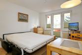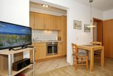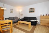 Der Wohnbereich der Ferienwohnung ist mit zwei Couchen und einem Flachbild-TV eingerichtet. Der integrierte Essbereich bietet zwei Personen genügend Platz für gemeinsame Mahlzeiten. Mit wenigen Handgriffen wird aus der Lederschlafcouch (160 x 200 cm) ein bequemer Schlafplatz. Als Sicht- und Sonnenschutz sind alle Fenster mit Plissees versehen.