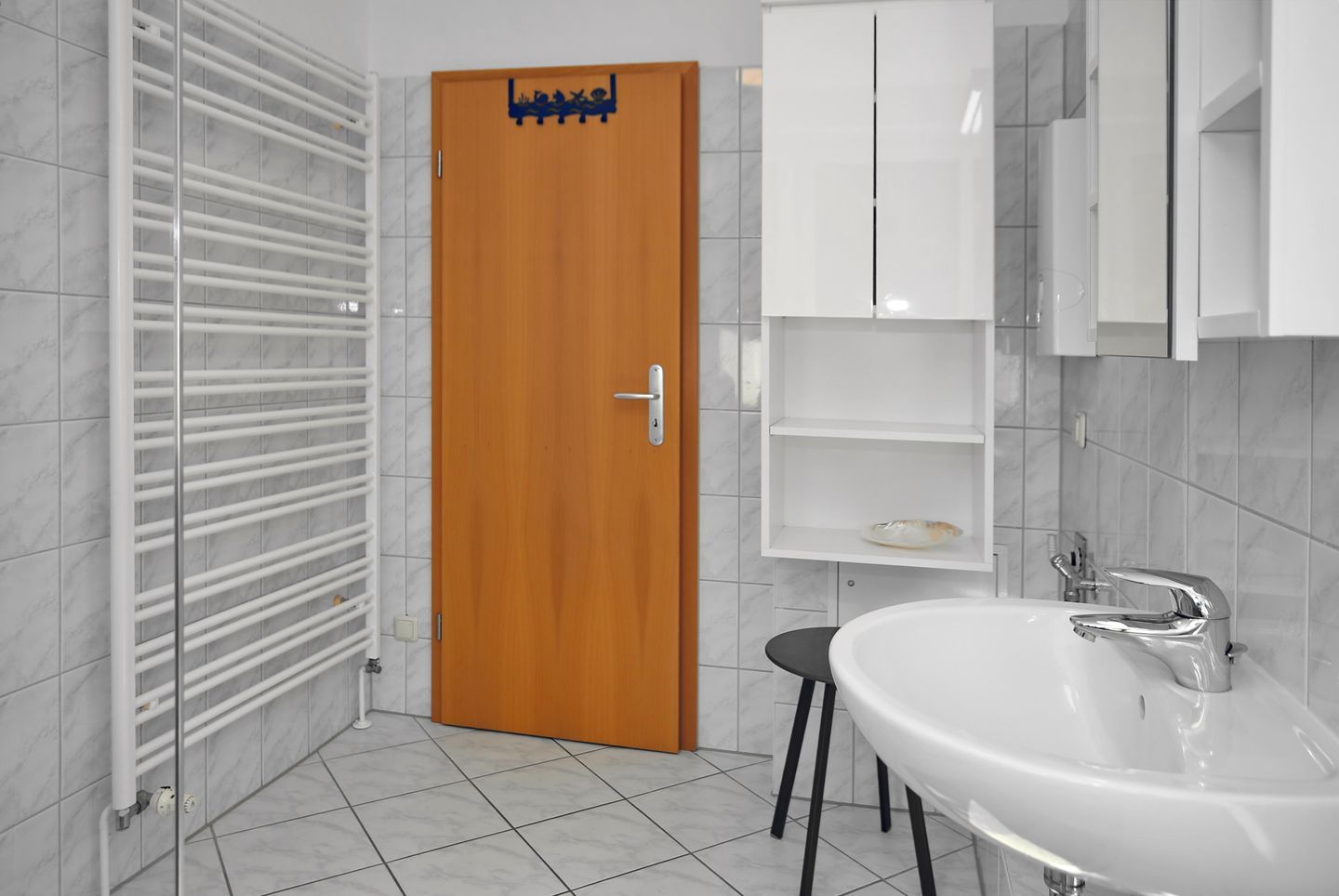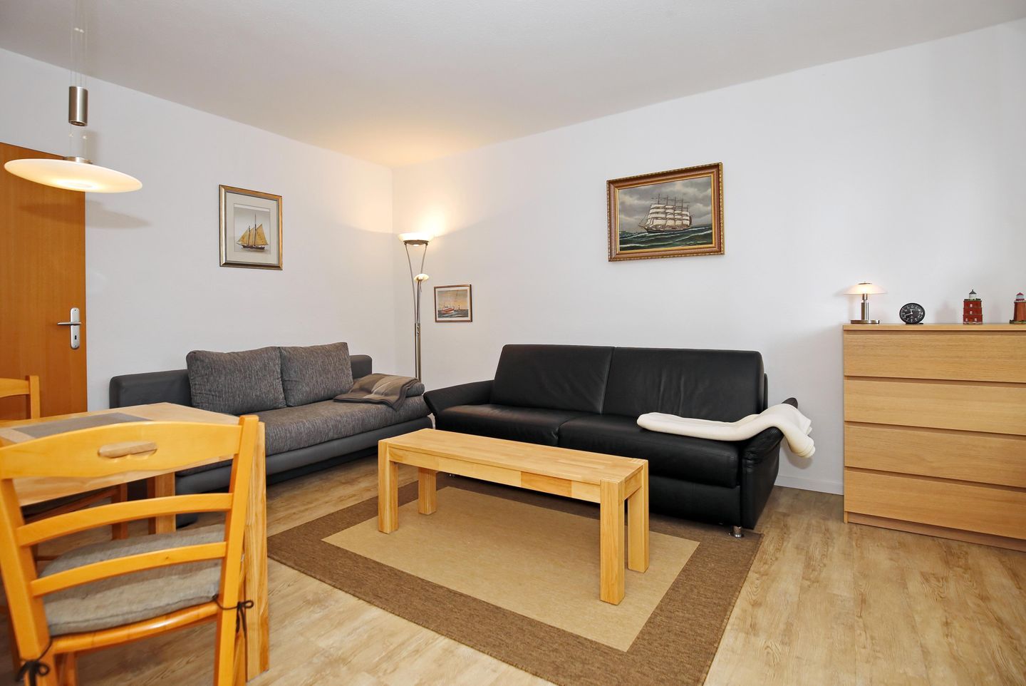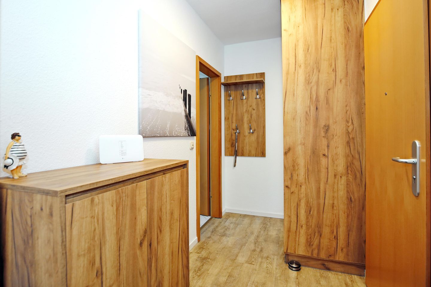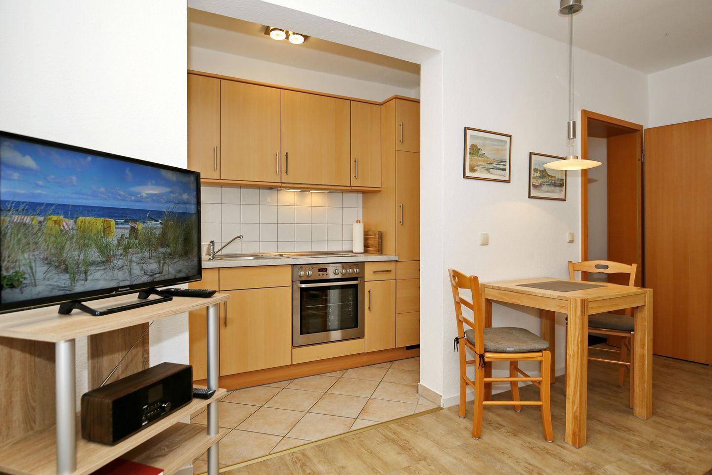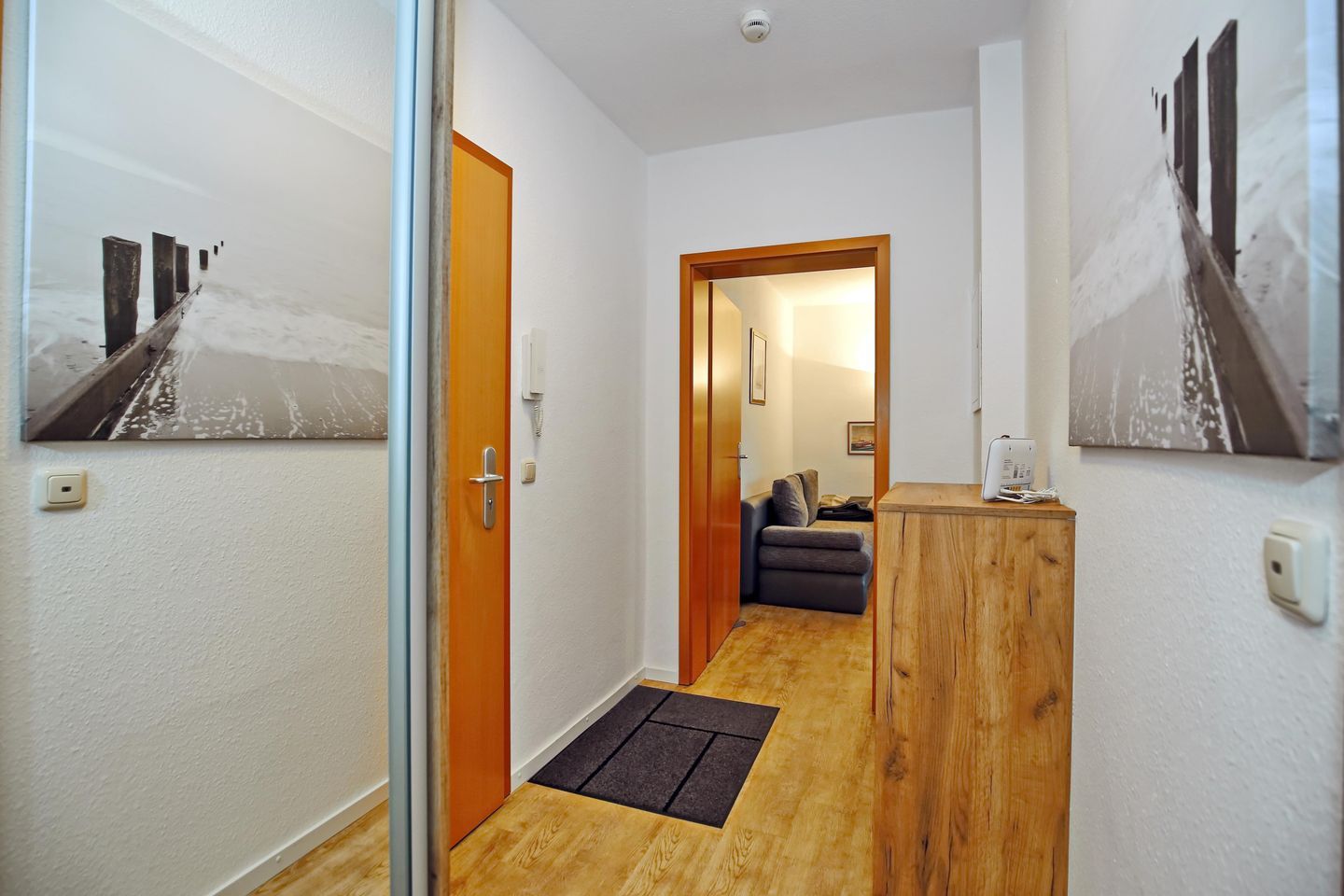 Im Tageslichtbad mit WC erwarten Sie eine nahezu barrierefreie Dusche sowie ein Schrank mit viel Stauraum, ein Föhn, ein Spiegelschrank und ein beheizbarer Handtuchhalter. Das Bad und der Küchenbereich sind gefliest. Im Flur und im Wohnbereich ist Designbelag in Eichenoptik verlegt. Im Flur bieten ein Kleiderschrank und eine Kommode viel Stauraum für Ihr Urlaubsgepäck.