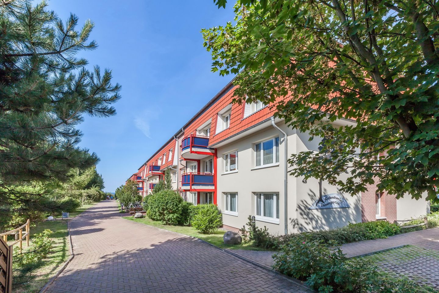 Eingebettet in eine liebevoll gestaltete Grünanlage mit einem kleinen Bachlauf sorgt die Ferienanlage „Dünengarten“ für einen erholsamen Urlaub. Ein besonderes Highlight ist der hauseigene Strandzugang. Ein Supermarkt und das Ostseekino befinden sich in der Nähe.