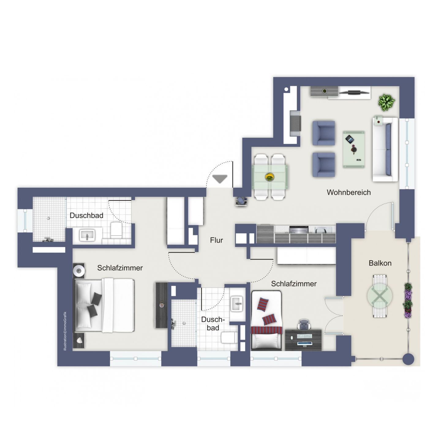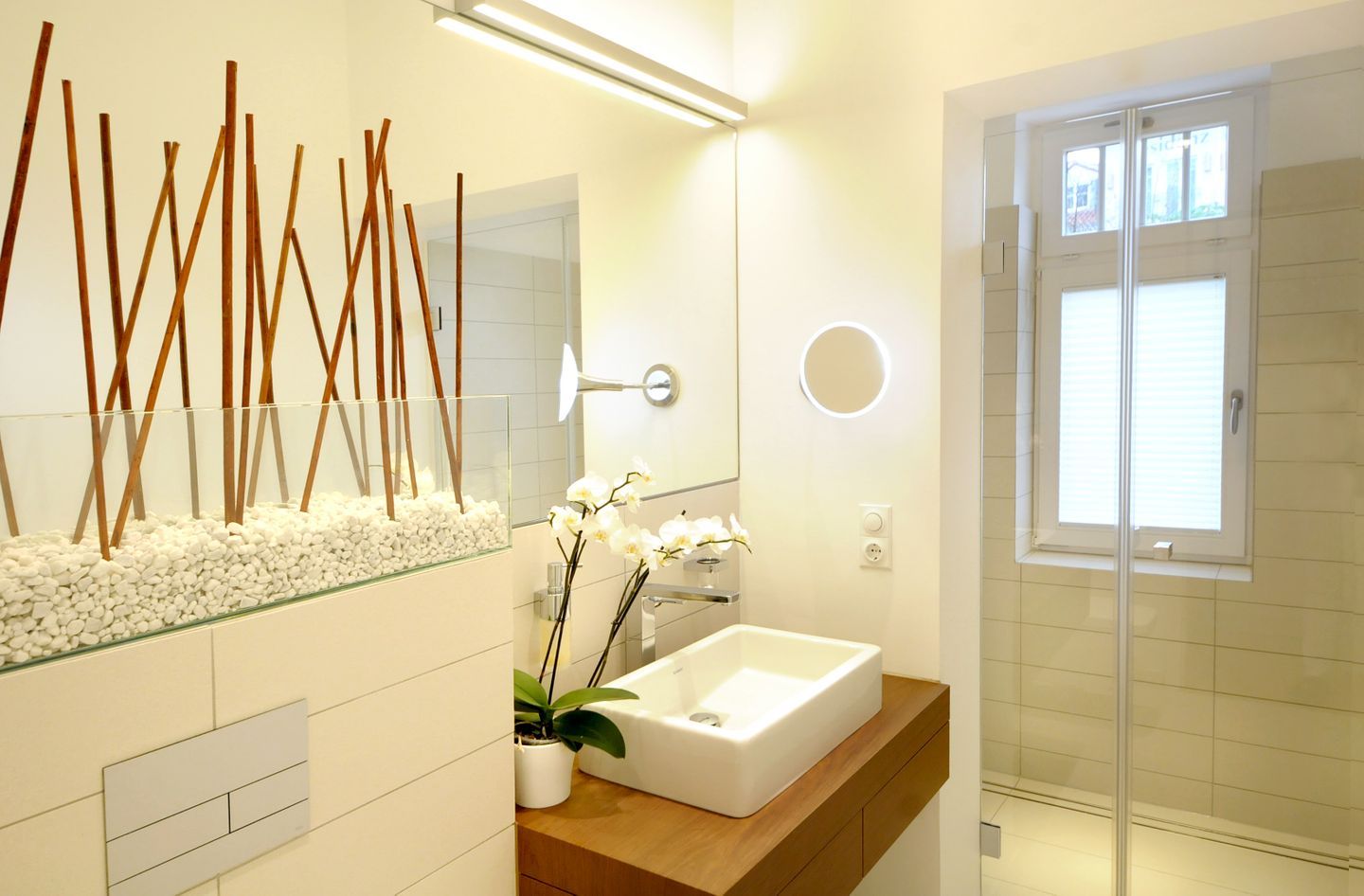 Beide Tageslichtbäder sind hell und modern gestaltet. Jedes Bad verfügt über eine ebenerdige Dusche, ein WC, einen Waschtisch mit Waschbecken, einen großen beleuchteten Spiegel sowie einen Kosmetikspiegel und einen Föhn. Ein Badezimmer ist über den Flur zugänglich, das zweite erreichen Sie direkt vom ersten Schlafzimmer aus. Beide Bäder sind gefliest.